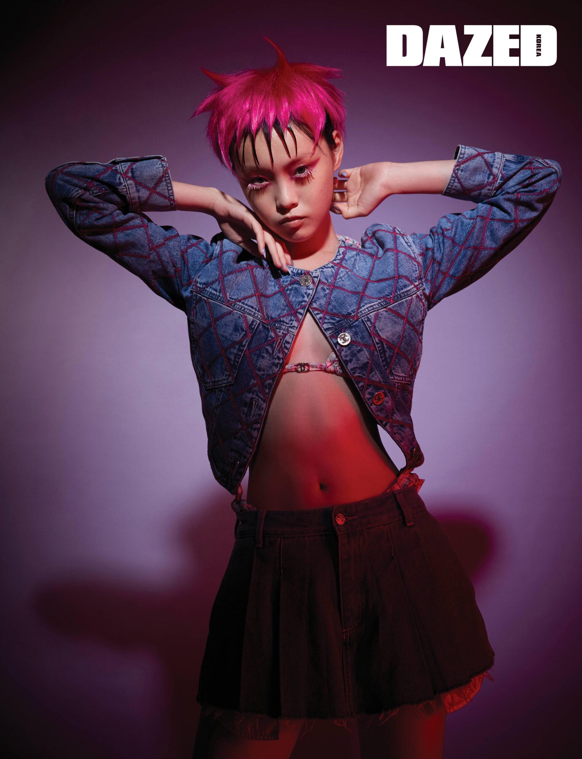 엠브로이더리 데님 재킷과 프린트 저지 소재의 스윔슈트 브라톱, 브리프 셋업은 모두 샤넬(Chanel), 플리츠 데님 팬츠는 사이다(Cider), 블루 오벌 네일 팁은 핑거수트(Finger Suit).