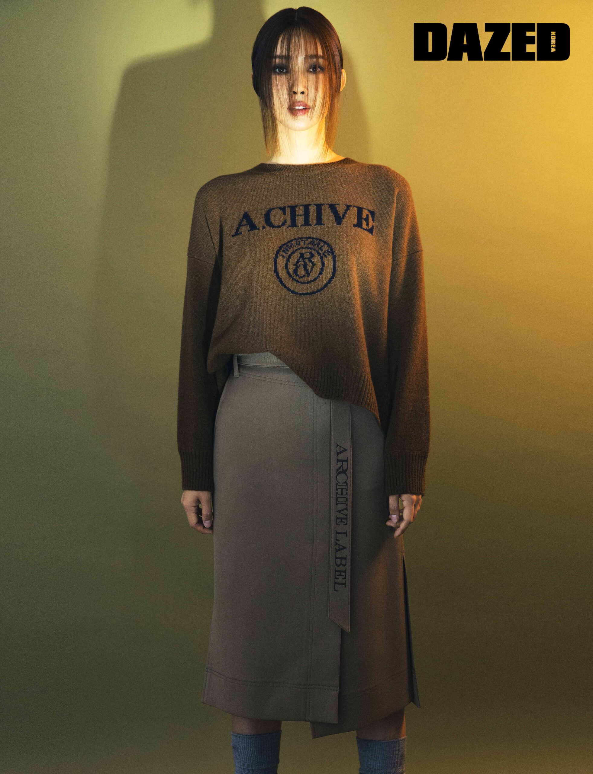 아카이브 풀오버와 캐멀 컬러 벨티드 슬릿 스커트는 보브(VOV), 타이츠는 스타일리스트의 것.