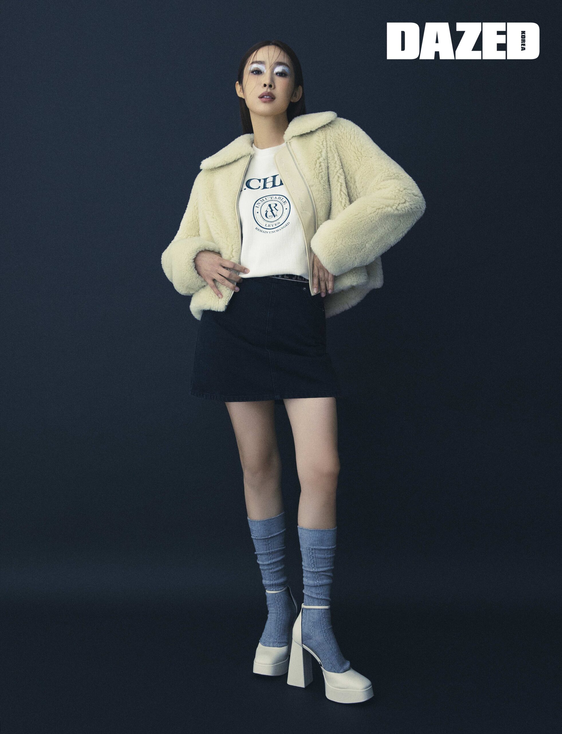 레터링 디테일 스웨트셔츠와 울 소재 칼라 포인트 쇼트 점퍼, 데님 미니스커트는 모두 보브(VOV), 타이츠와 플랫폼 슈즈는 스타일리스트의 것.