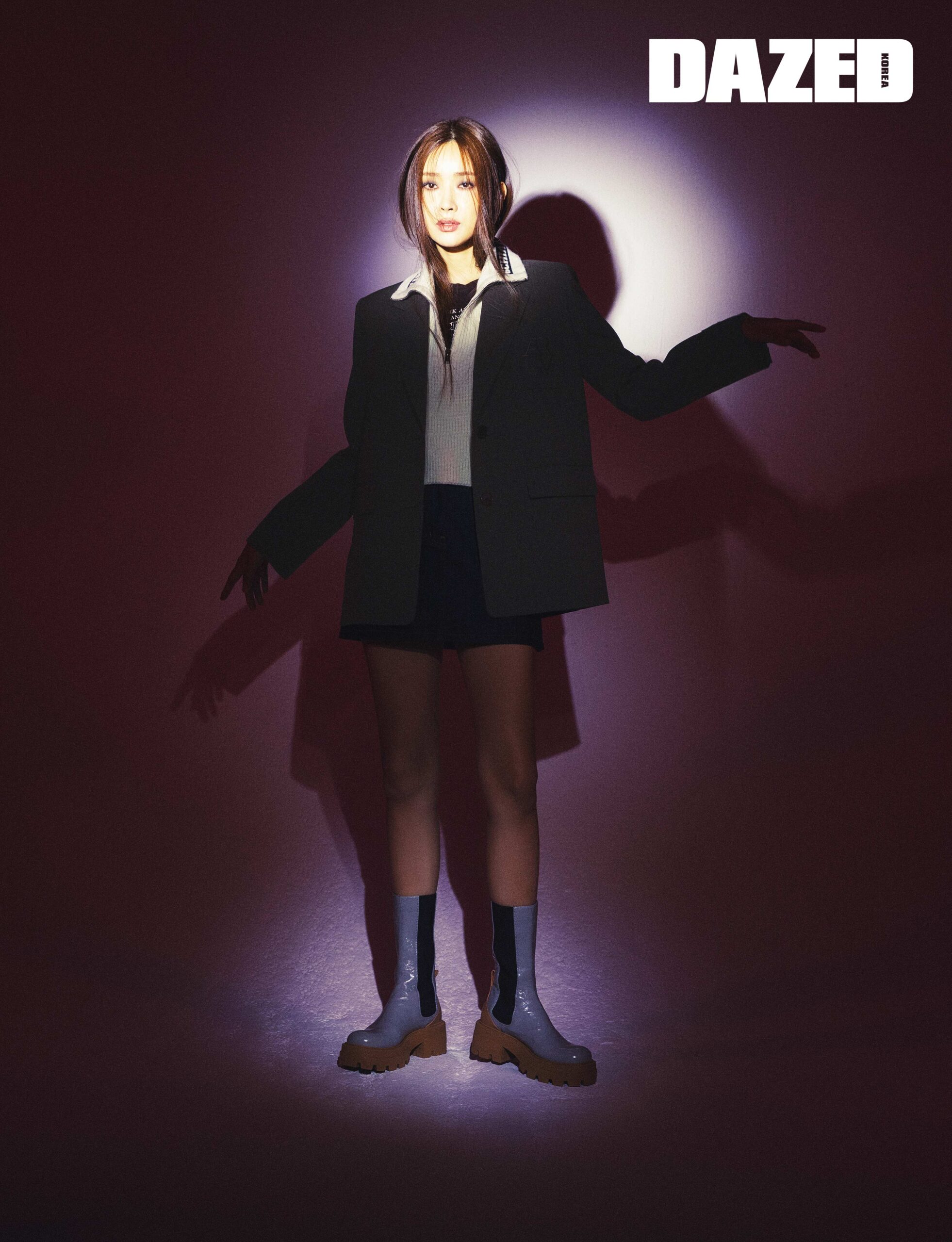 클래식한 테일러드 재킷과 아카이브 레이어링 하프 집업 베스트, 데님 미니스커트는 모두 보브(VOV), 앵클부츠는 스타일리스트의 것.