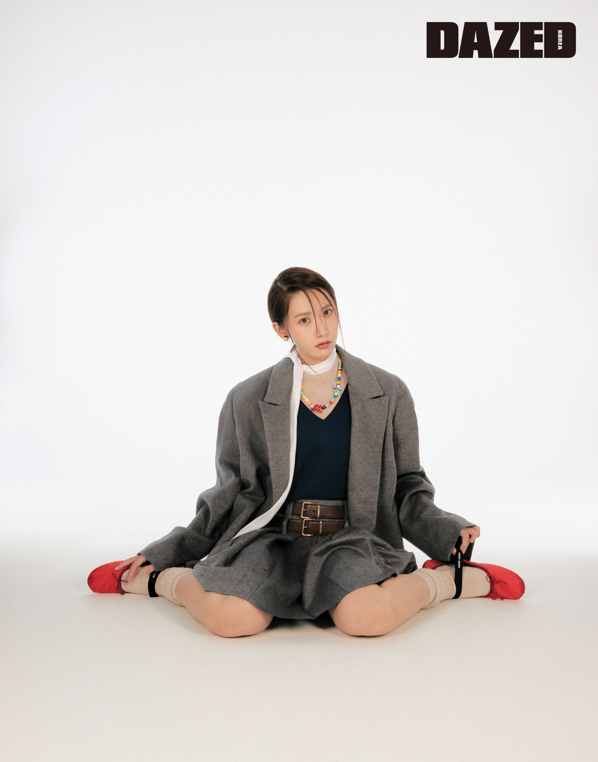 그레이 울 재킷과 네이비 니트, 화이트 시스루 블라우스, 그레이 플리츠스커트, 레드 실크 발레리나 슈즈, A Remedy 캡슐 이어링, A Remedy 코끼리와 낙타 펜던트 네크리스, 브라운 벨트, 베이지 삭스는 모두 미우미우(Miu Miu).