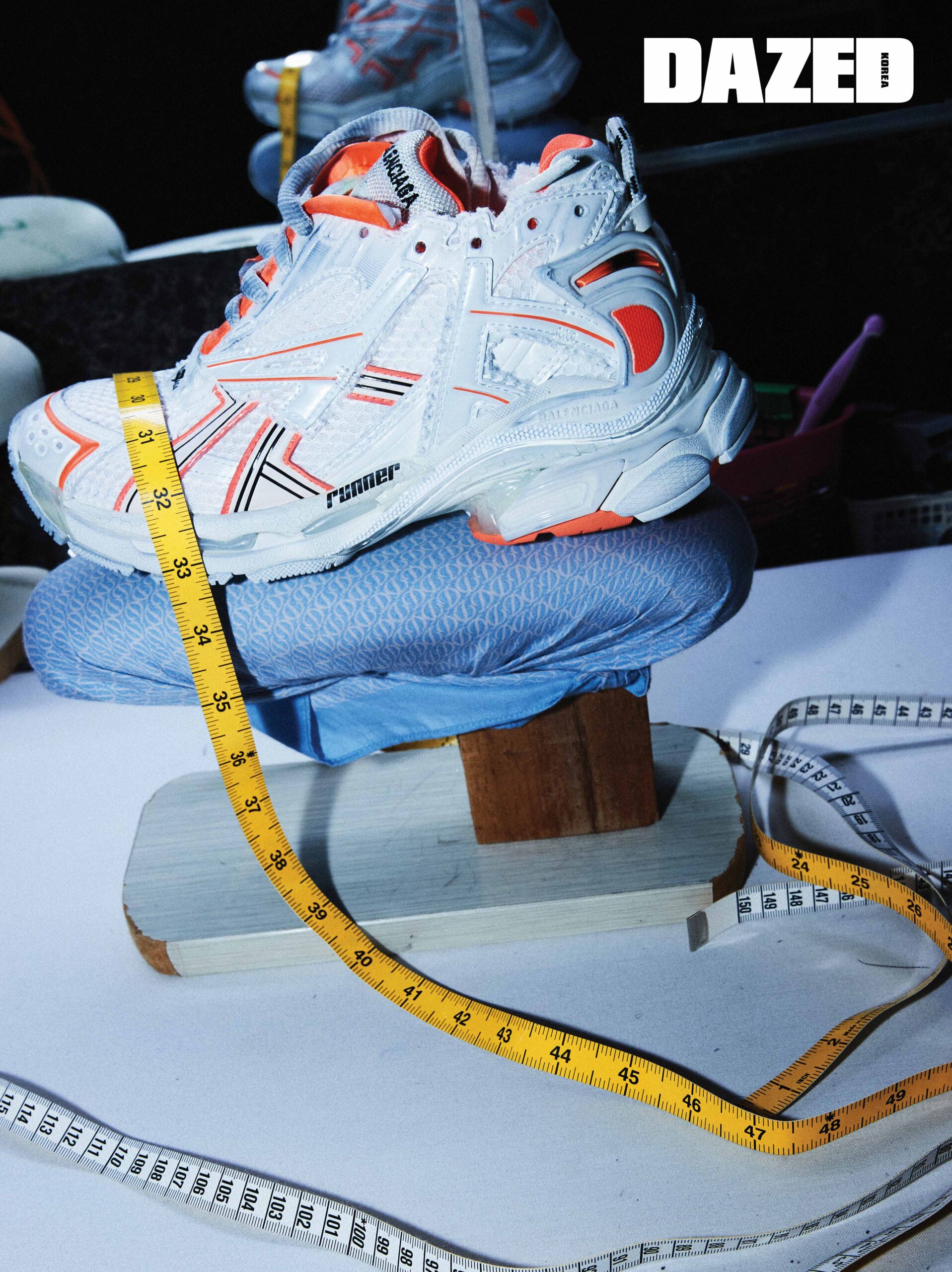 네온 오렌지와 화이트 컬러 배합의 러너 스니커즈는 발렌시아가(Balenciaga).