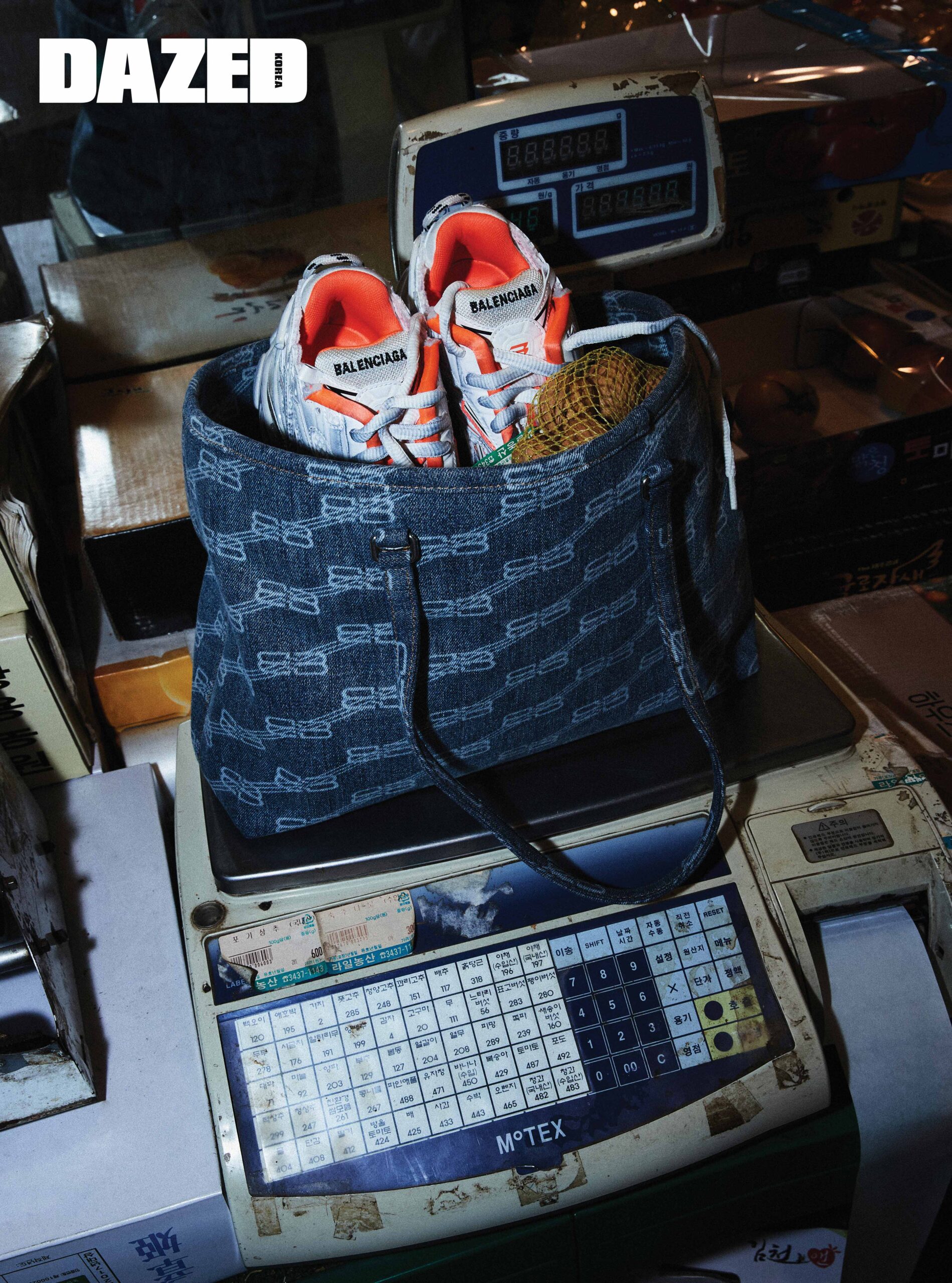 블리치드 데님 소재의 블루 BB 모노그램 이스트-웨스트 쇼퍼 백과 네온 오렌지와 화이트 컬러 배합의 러너 스니커즈는 발렌시아가(Balenciaga).