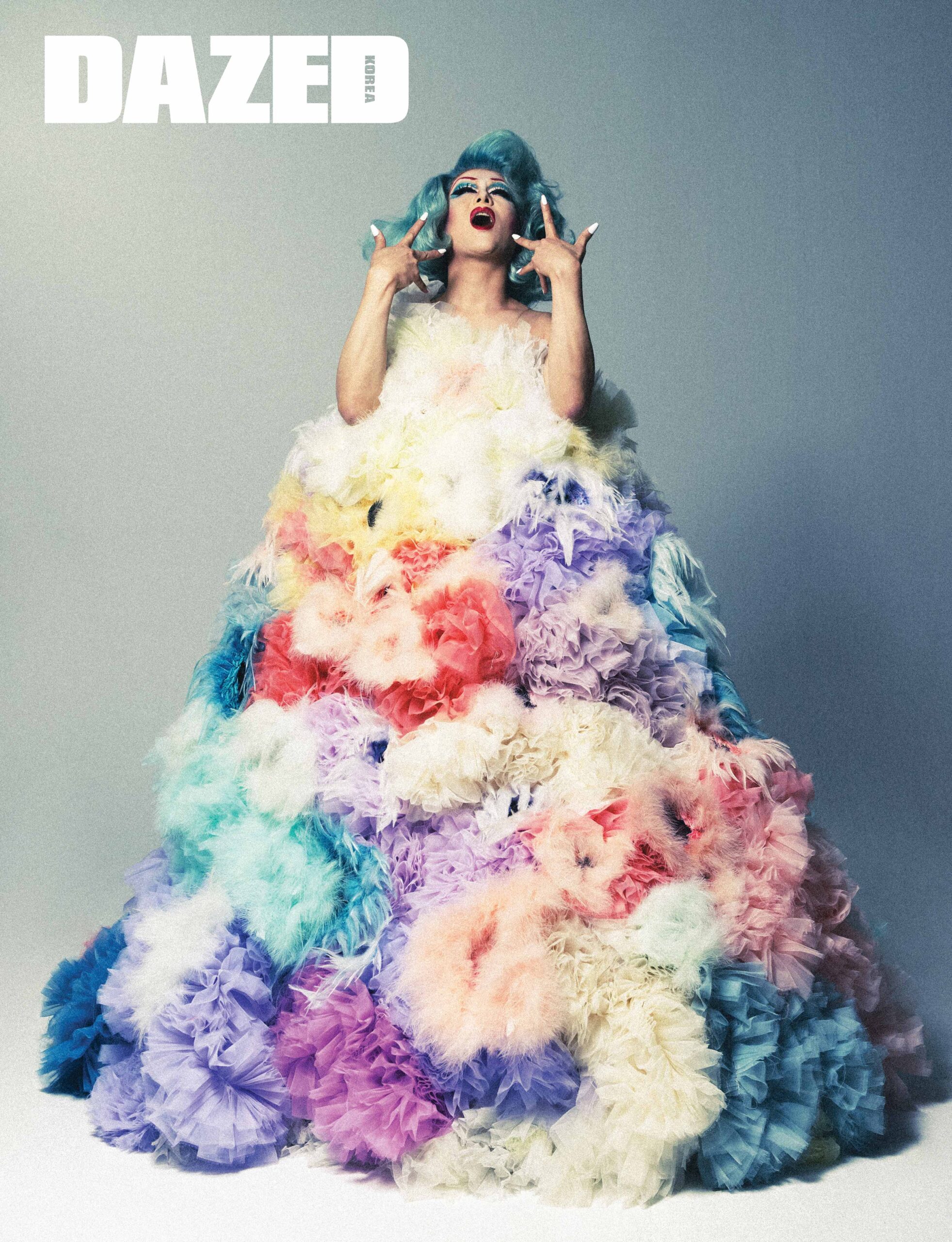 멀티컬러의 입체적 플라워 모티브 맥시 드레스는 안유미(Youmi Ahn), 화이트 코핀 셰이프 네일 팁은 핑거수트(Finger Suit).