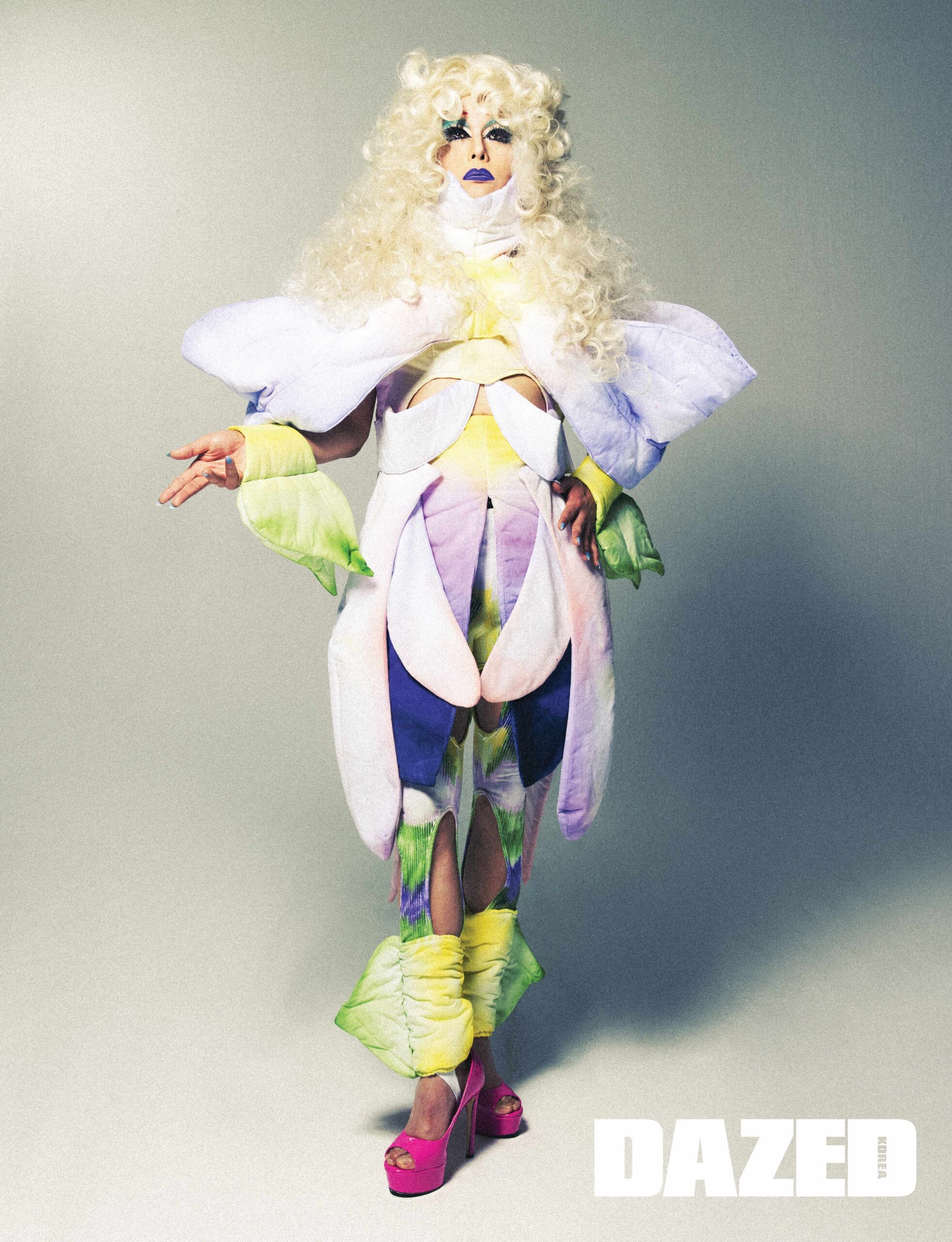 독일붓꽃 모티브의 슬리브리스 톱과 스커트, 타이츠, 암 워머는 모두 백새연(Baek Saeyeon), 블루 오펄 네일 팁은 핑거수트(Finger Suit).