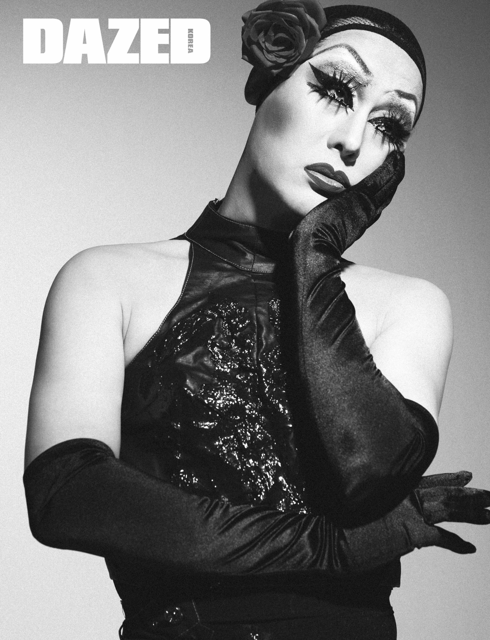블랙 레더와 우레탄 소재 슬리브리스 톱, 팬츠는 박현원(Hyunppark), 코르셋과 글러브는 니나노의 것.
