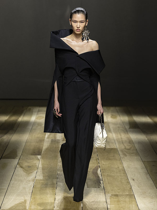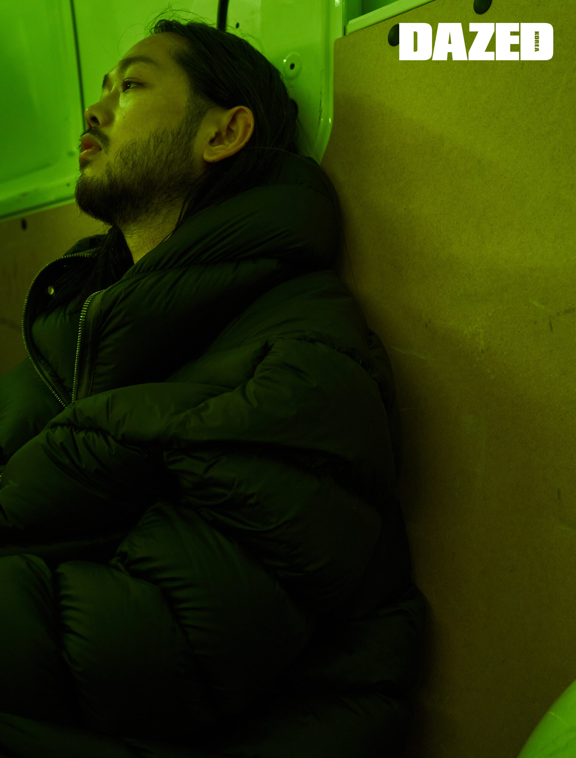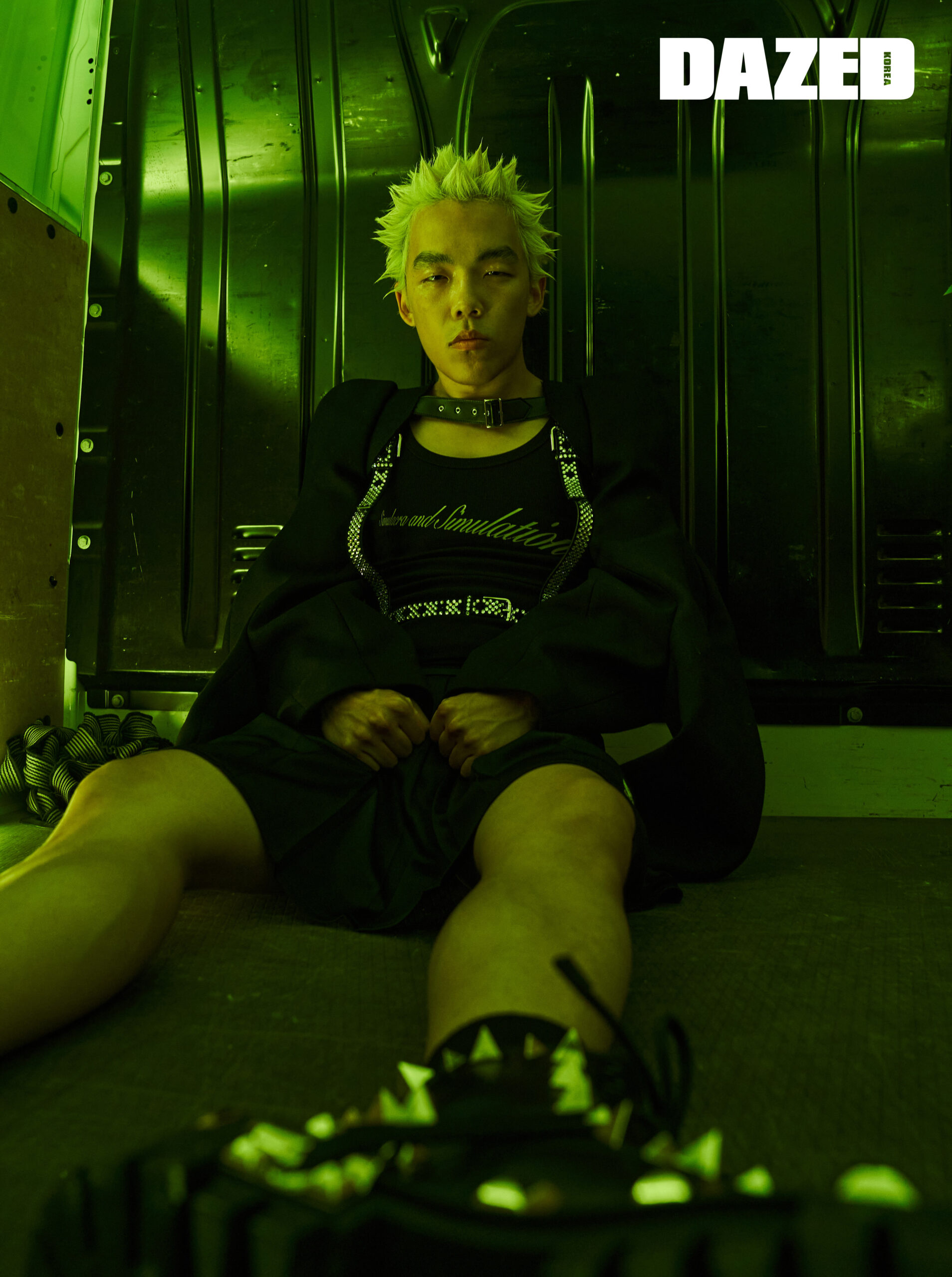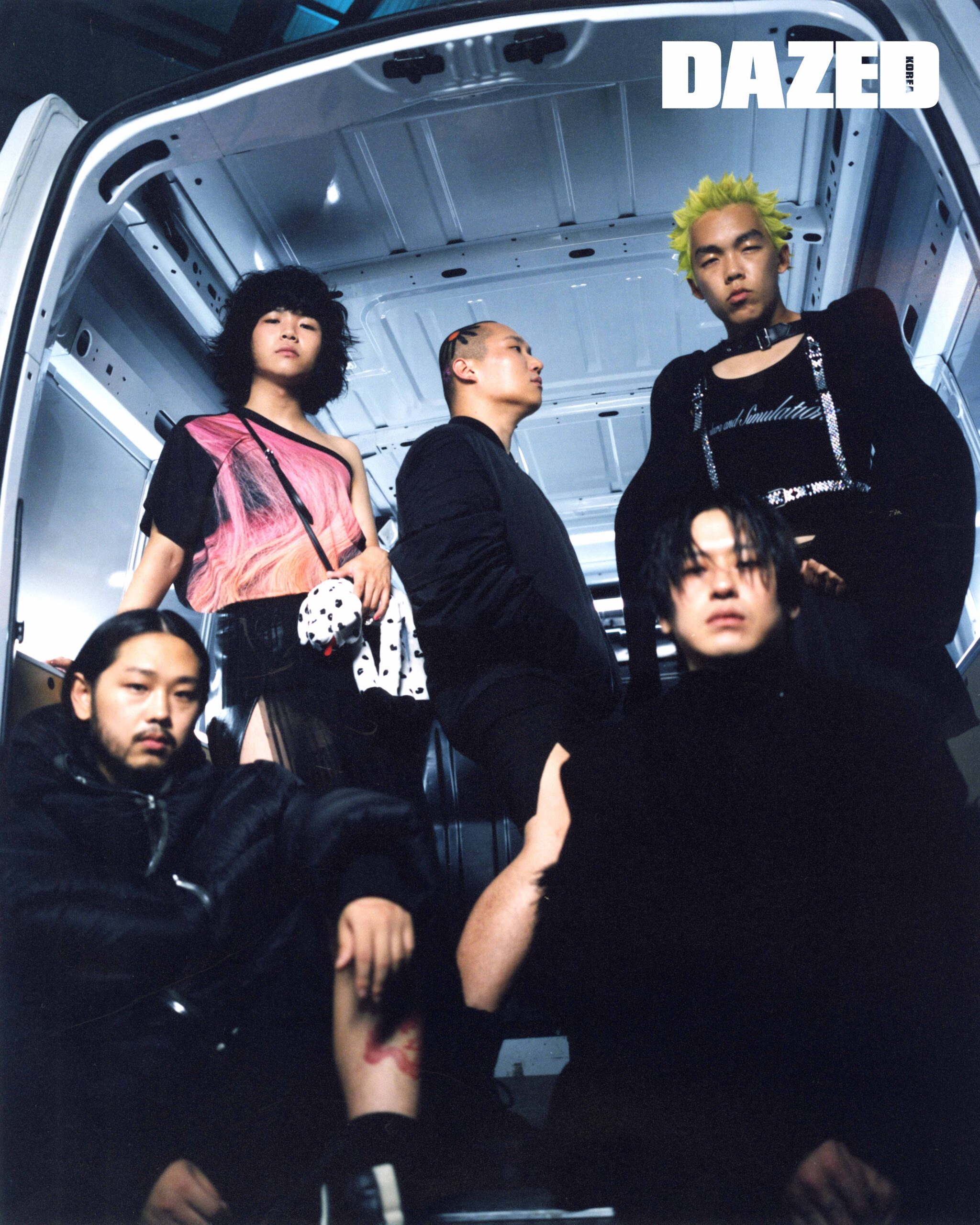 수호가 입은 컷아웃 디테일 후드 롱 패딩 점퍼와 쇼츠, 레이어링한 랩스커트, 하이톱 스니커즈는 모두 릭 오웬스(Rick Owens), 삭스는 에디터의 것. 머드 더 스튜던트가 입은 핑크 헤어 프린트 오버사이즈 티셔츠는 2000아카이브스(2000Archives), 레더 소재의 랩스커트는 릭 오웬스(Rick Owens), 레이어링한 샤 스커트는 와이씨에이치(YCH), 달마티안 백은 모스키노(Moschino). 산얀이 입은 보머 재킷과 쇼츠는 릭 오웬스(Rick Owens), 슈즈는 프라다 리네아 로사(Prada Linea Rossa). 오메가사피엔이 입은 로고 프린트 탱크톱은 2000아카이브스(2000Archives), 플리츠스커트는 아디다스 오리지널스(adidas Originals), 크리스털 디테일 하네스는 돌체앤가바나(Dolce&Gabbana), 블랙 볼레로 재킷은 에디터의 것. bj원진이 입은 블랙 퍼 디테일 코트와 이너로 착용한 터틀넥 톱, 블랙 팬츠는 모두 프라다(Prada).