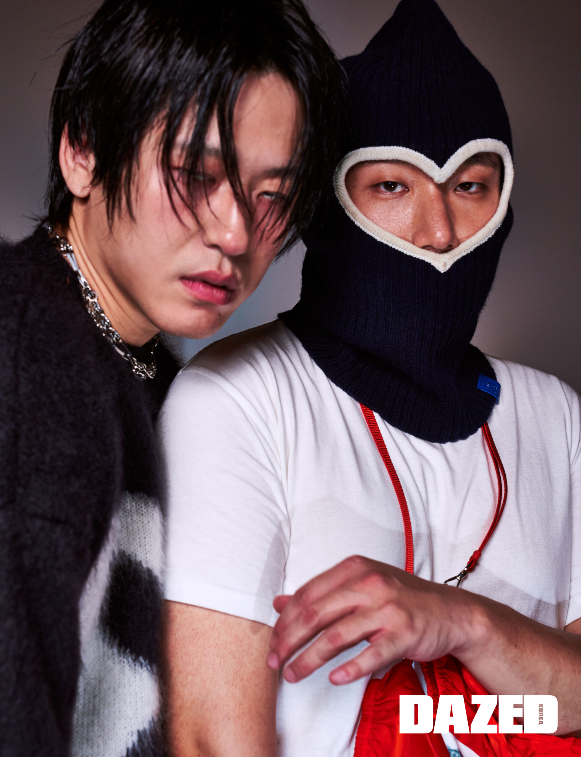 bj원진이 입은 모헤어 소재의 플레이보이 스웨트셔츠와 네크리스는 생 로랑 by 안토니 바카렐로(Saint Laurent by Anthony Vaccarello). 산얀이 쓴 하트 셰이프 발라클라바는 로에베(Loewe), 목에 건 오렌지 글러브는 프라다(Prada), 티셔츠는 에디터의 것.