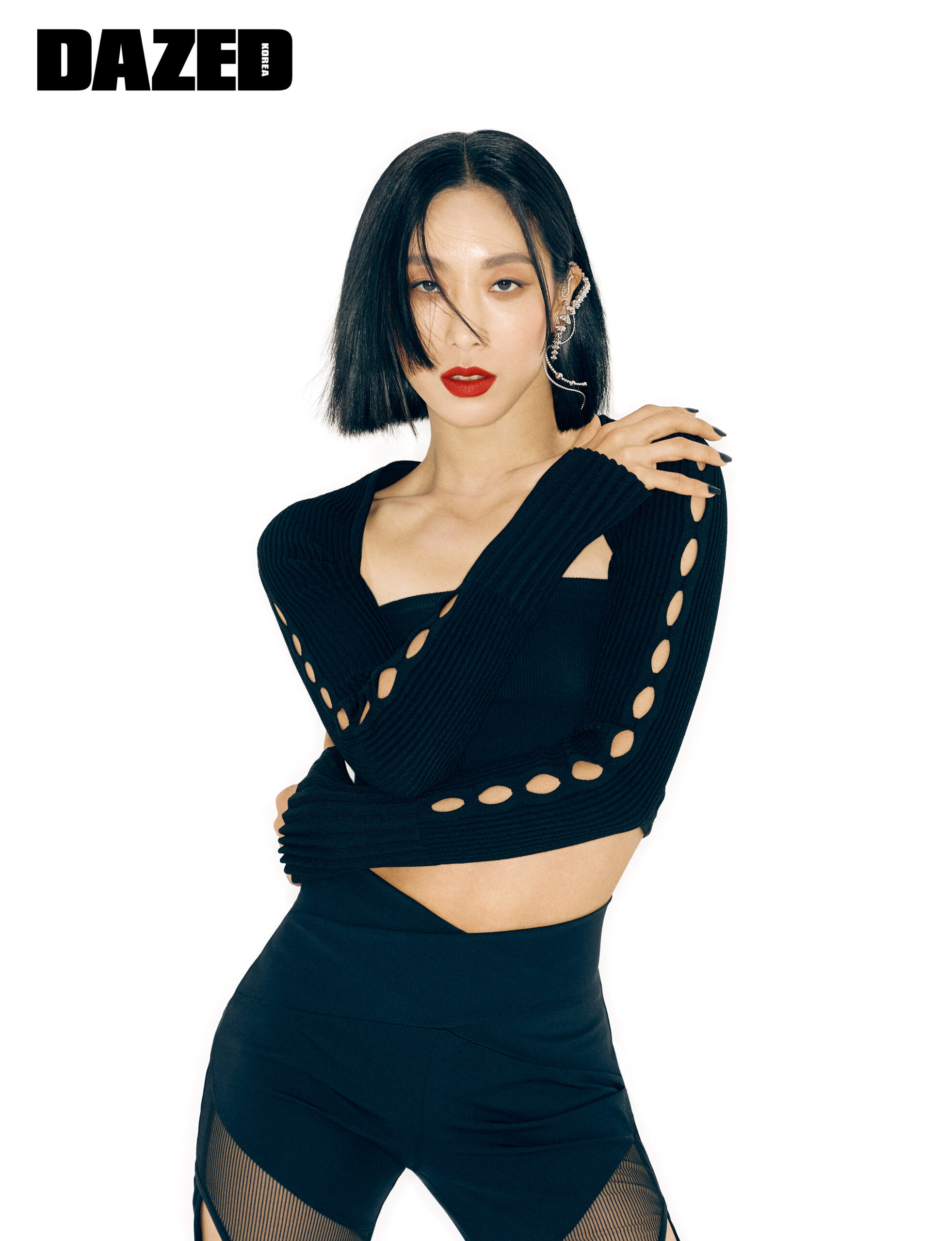 컷아웃 디테일의 리브드 니트 볼레로는 알브이엔(RVN), X자 웨이스트 밴딩이 특징인 컷아웃 디테일의 팬츠는 쿄(Kyo), 유기적 곡선이 돋보이는 이어 커프는 복초이(Vokchoi), 브라톱은 에디터의 것.