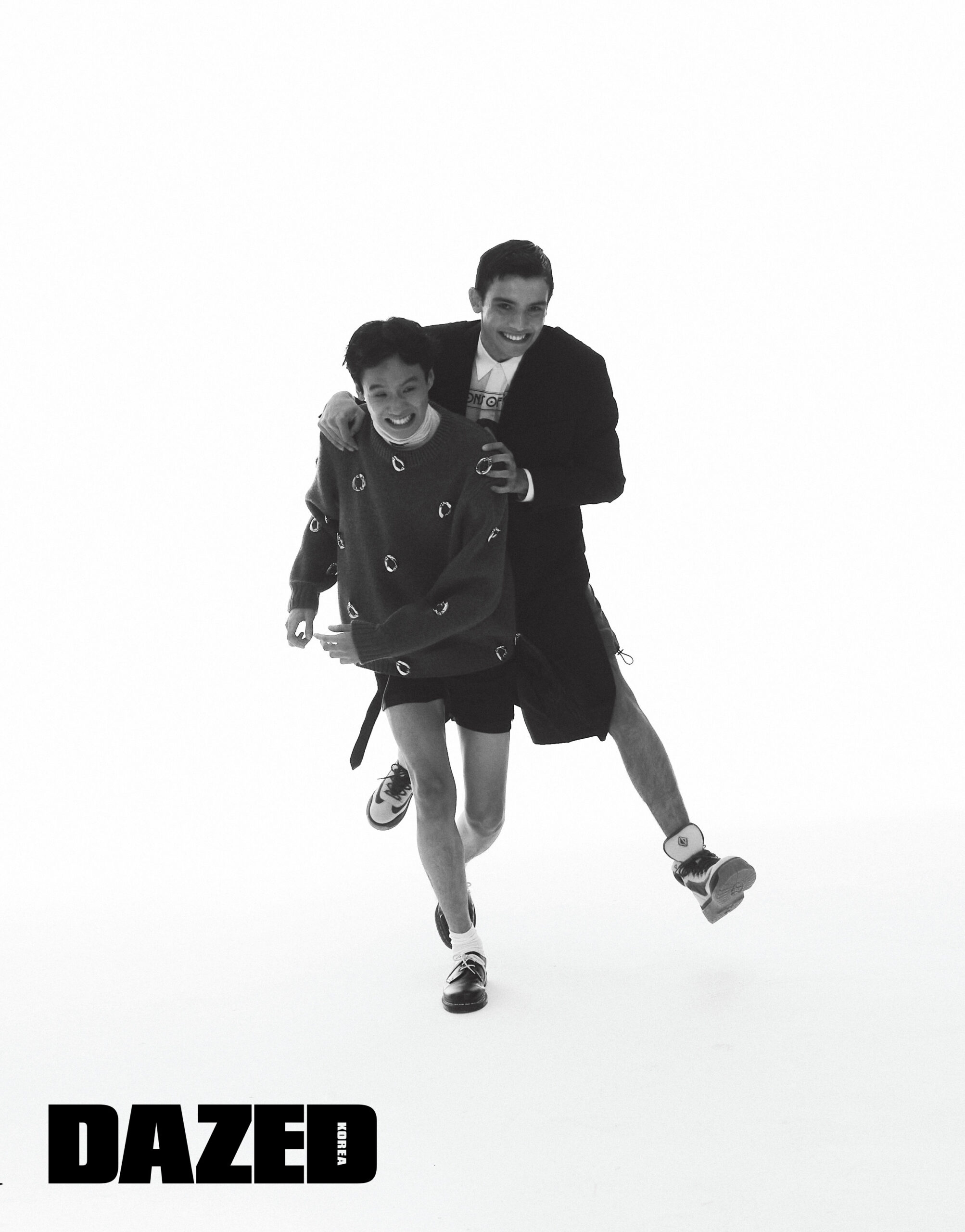 조니가 입은 니트 톱은 버버리(Burberry), 이너로 착용한 터틀넥 톱은 에트로(Etro), 슈즈는 닥터마틴(Dr. Martens), 쇼츠와 벨트로 연출한 타이, 삭스는 에디터의 것. 악셀이 입은 재킷과 프린트 셔츠, 쇼츠, 슈즈는 모두 디올 맨(Dior Men).