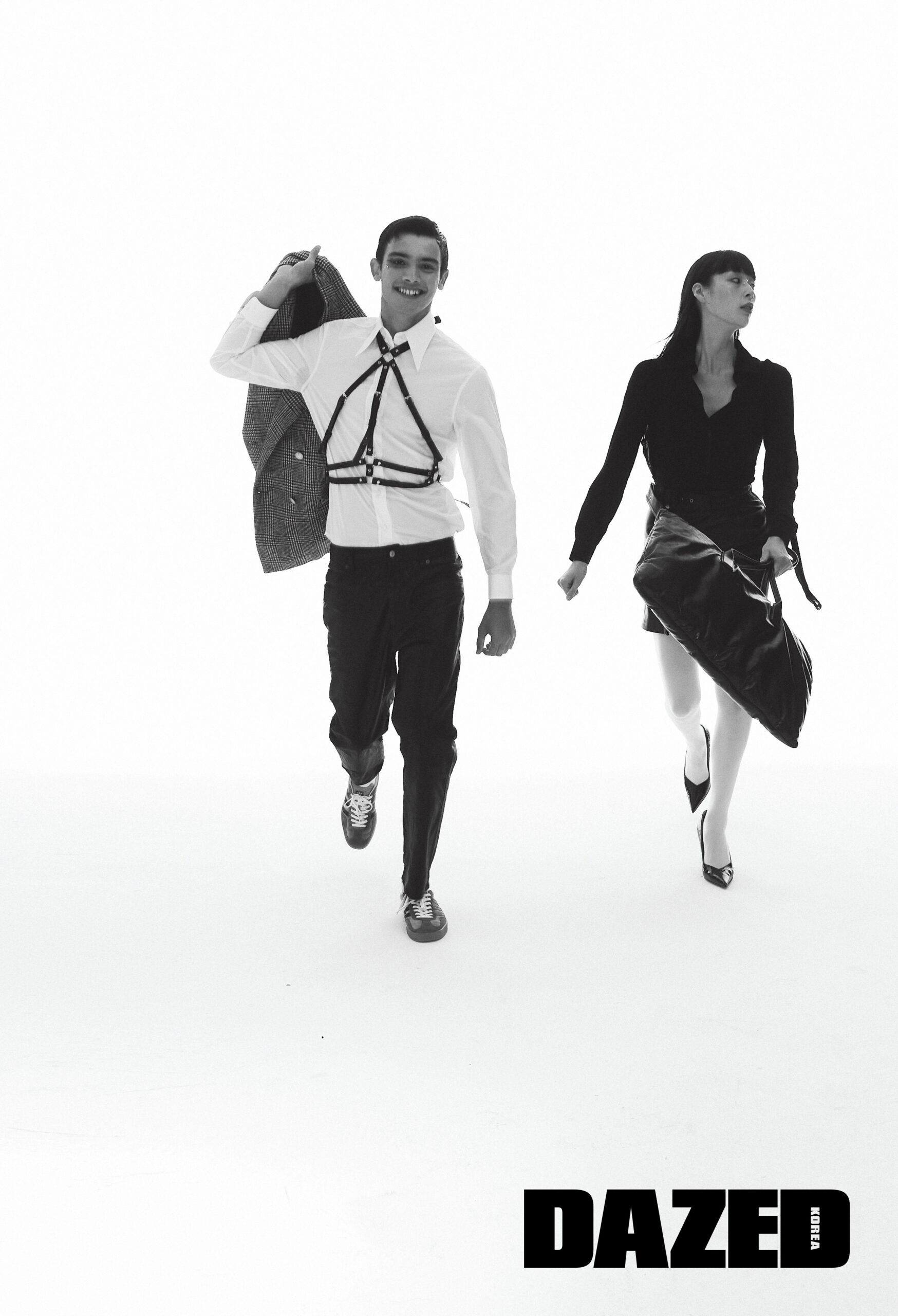 악셀이 입은 셔츠와 손에 든 재킷, 팬츠는 모두 구찌(Gucci), 스니커즈는 구찌ⅹ아디다스(Gucciⅹadidas), 하네스는 에디터의 것. 조안이 입은 본디지 레이스 디테일의 실크 블라우스는 모스키노(Moschino), 레이어링한 코르셋 브라톱은 SMFK, 레더 스커트는 홀리넘버세븐(Holly Number 7), 레드 레더 펌프스와 빅 레더 백은 보테가 베네타(Bottega Veneta), 타이츠는 에디터의 것.