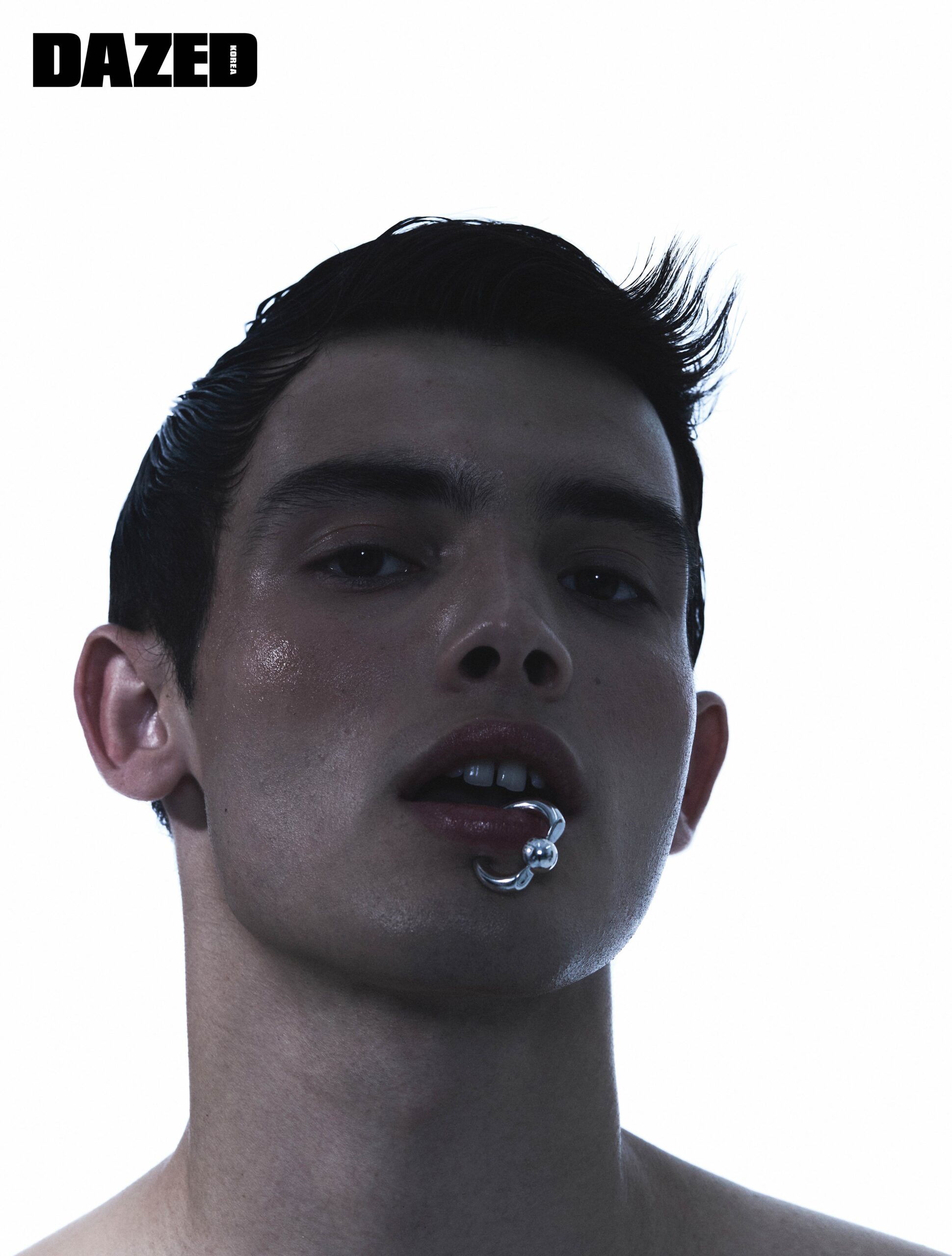 입술에 착용한 볼 디테일 이어 커프는 발렌시아가(Balenciaga).