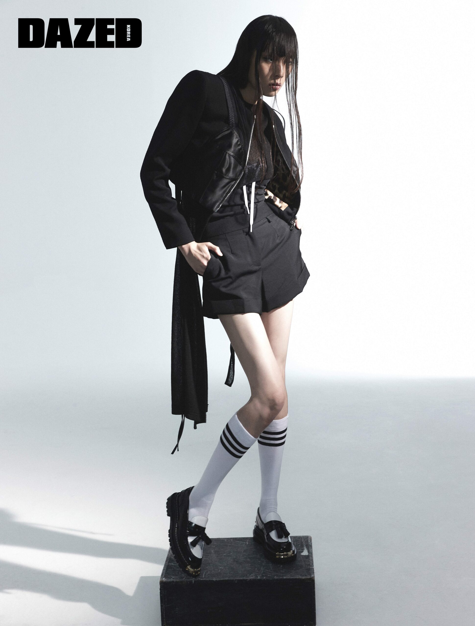 블랙 재킷은 모스키노(Moschino), 비대칭 시스루 후드 니트 톱은 그레이스 엘우드(Grace Ellwood), 이너로 착용한 레이스 디테일 탱크톱은 아디다스 오리지널스(adidas Originals), 블랙 모헤어 쇼트 팬츠는 디올(Dior), 앞코에 메탈을 장식한 태슬 레더 로퍼는 산드로(Sandro), 니삭스는 에디터의 것.