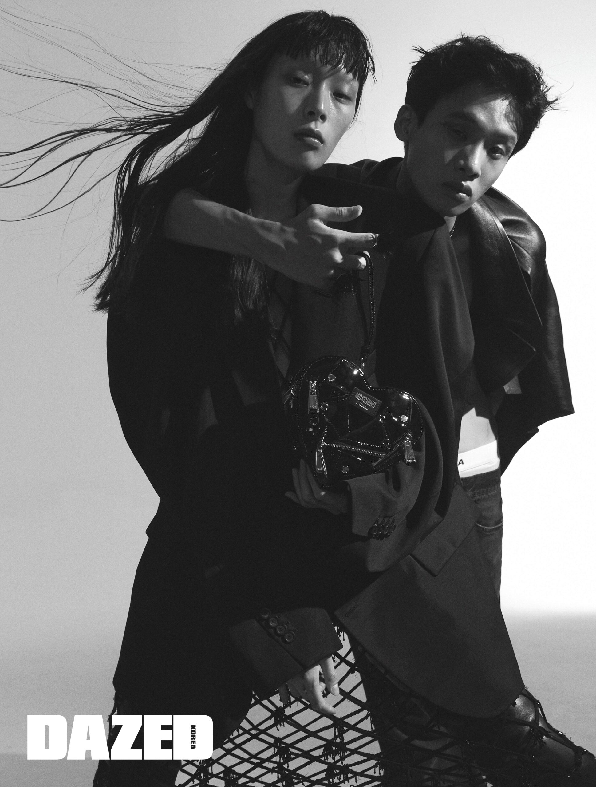 조안이 입은 오버사이즈 트위스트 슬리브 재킷은 발렌시아가(Balenciaga), 이너로 착용한 비즈 네트 드레스는 가니(Ganni), 레더 롱부츠는 지방시(Givenchy). 조니가 입은 플레어 데님 팬츠와 로고 브리프, 키 펜던트 네크리스는 모두 발렌시아가(Balenciaga), 깃털 장식 실버 링은 지방시(Givenchy). 하트 셰이프 레더 바이커 백은 모스키노(Moschino), 레더 소재 재킷은 에디터의 것.