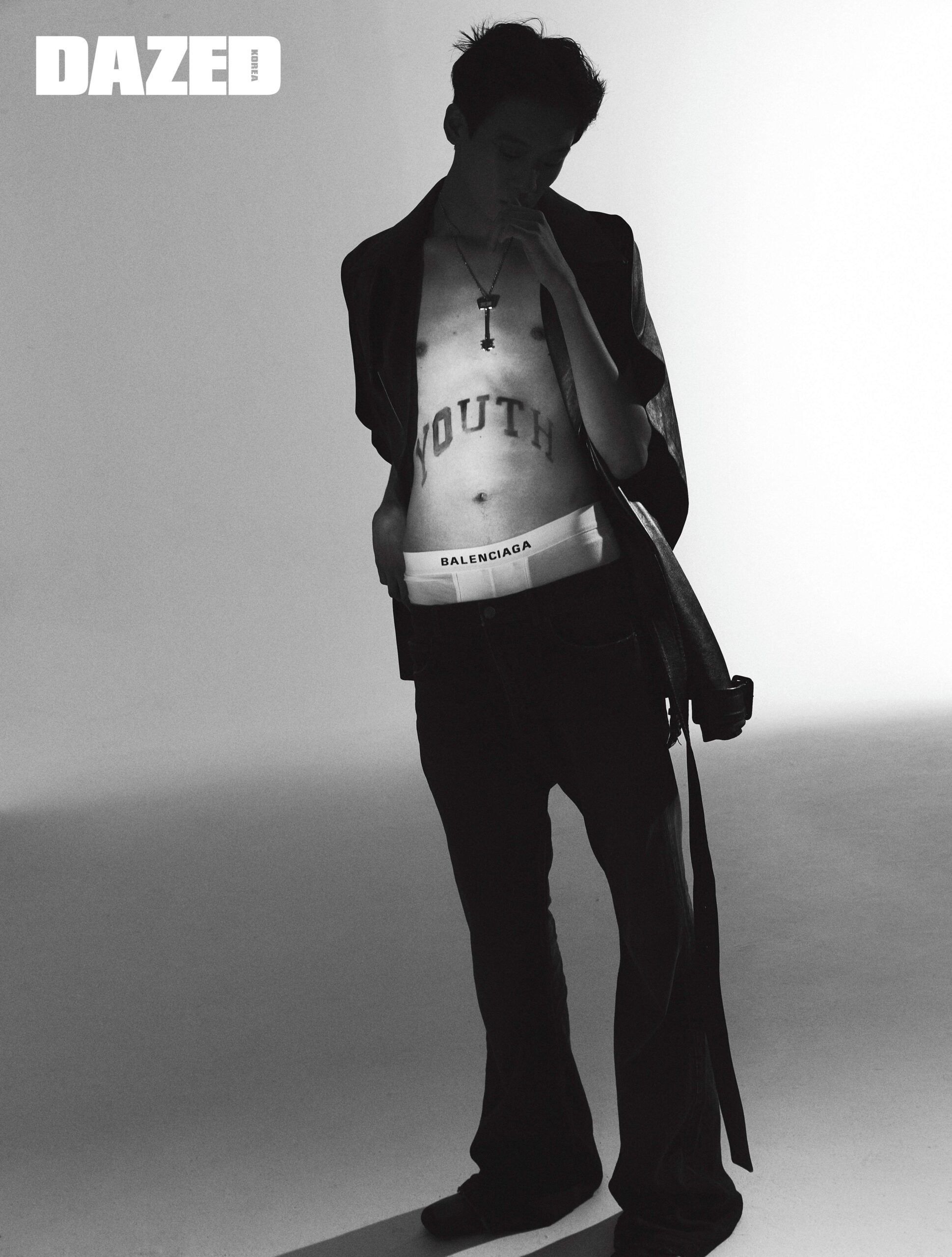 플레어 데님 팬츠와 로고 브리프, 블랙 레더 뮬, 키 펜던트 네크리스는 모두 발렌시아가(Balenciaga), 레더 소재 재킷은 에디터의 것.