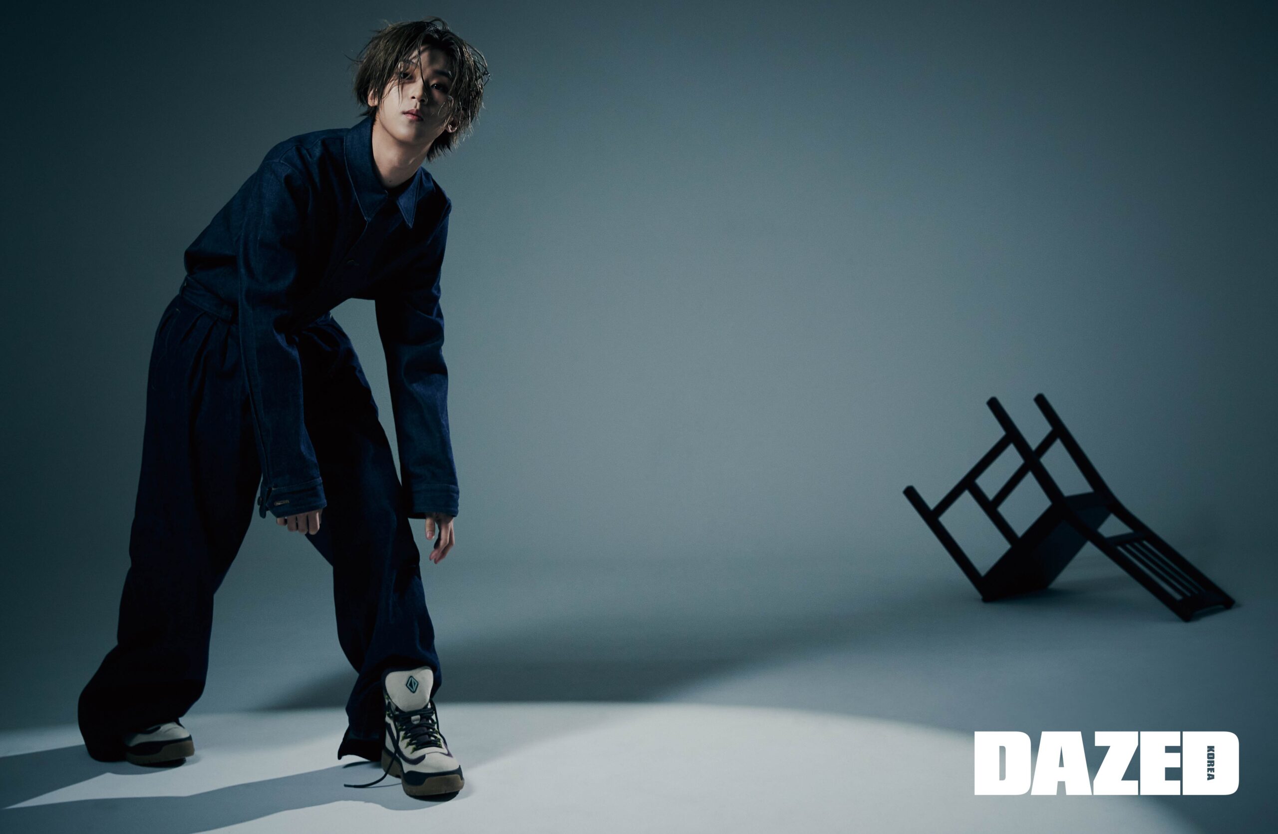데님 셋업은 메종 마르지엘라(Maison Margiela), 스니커즈는 디올 맨(Dior Men).