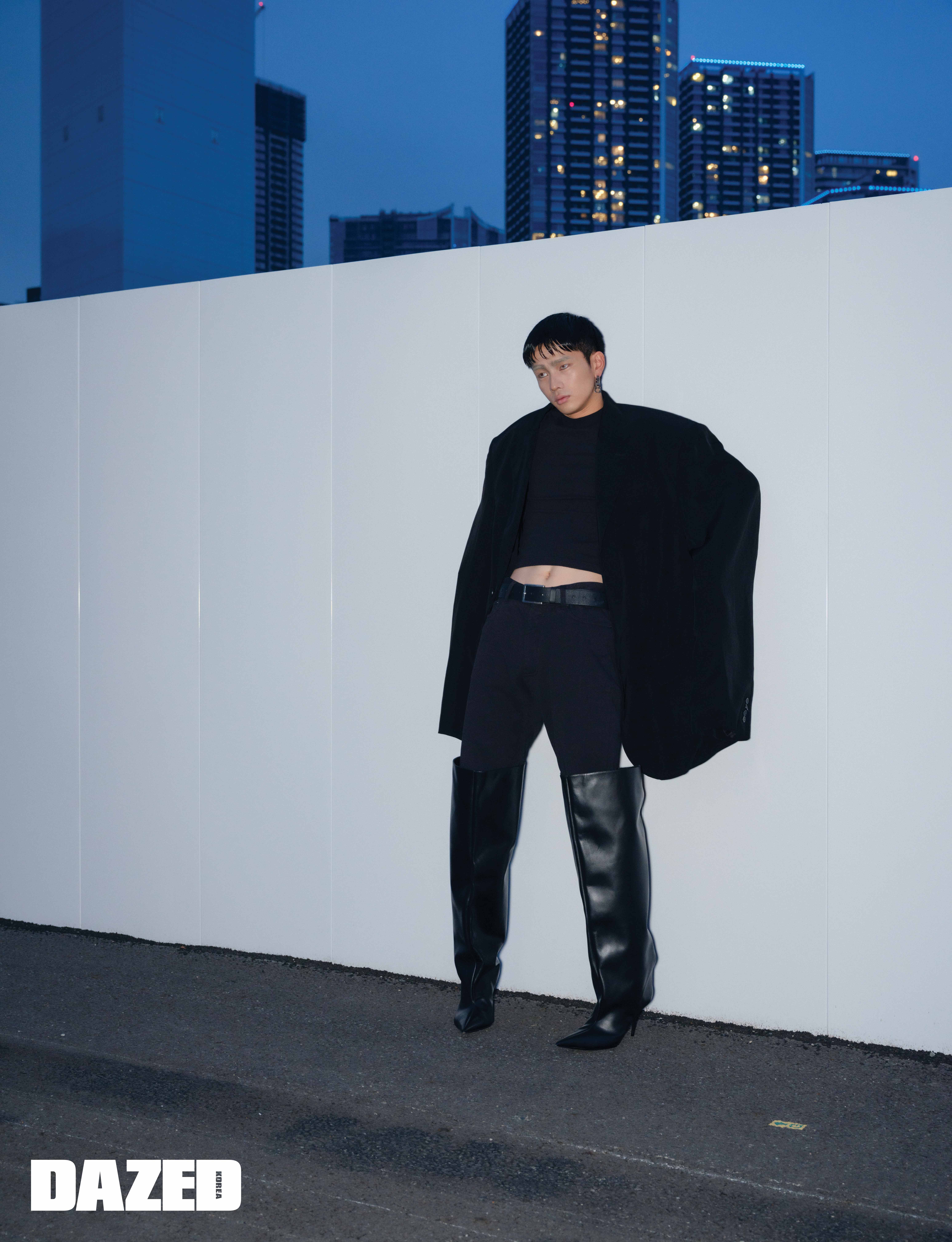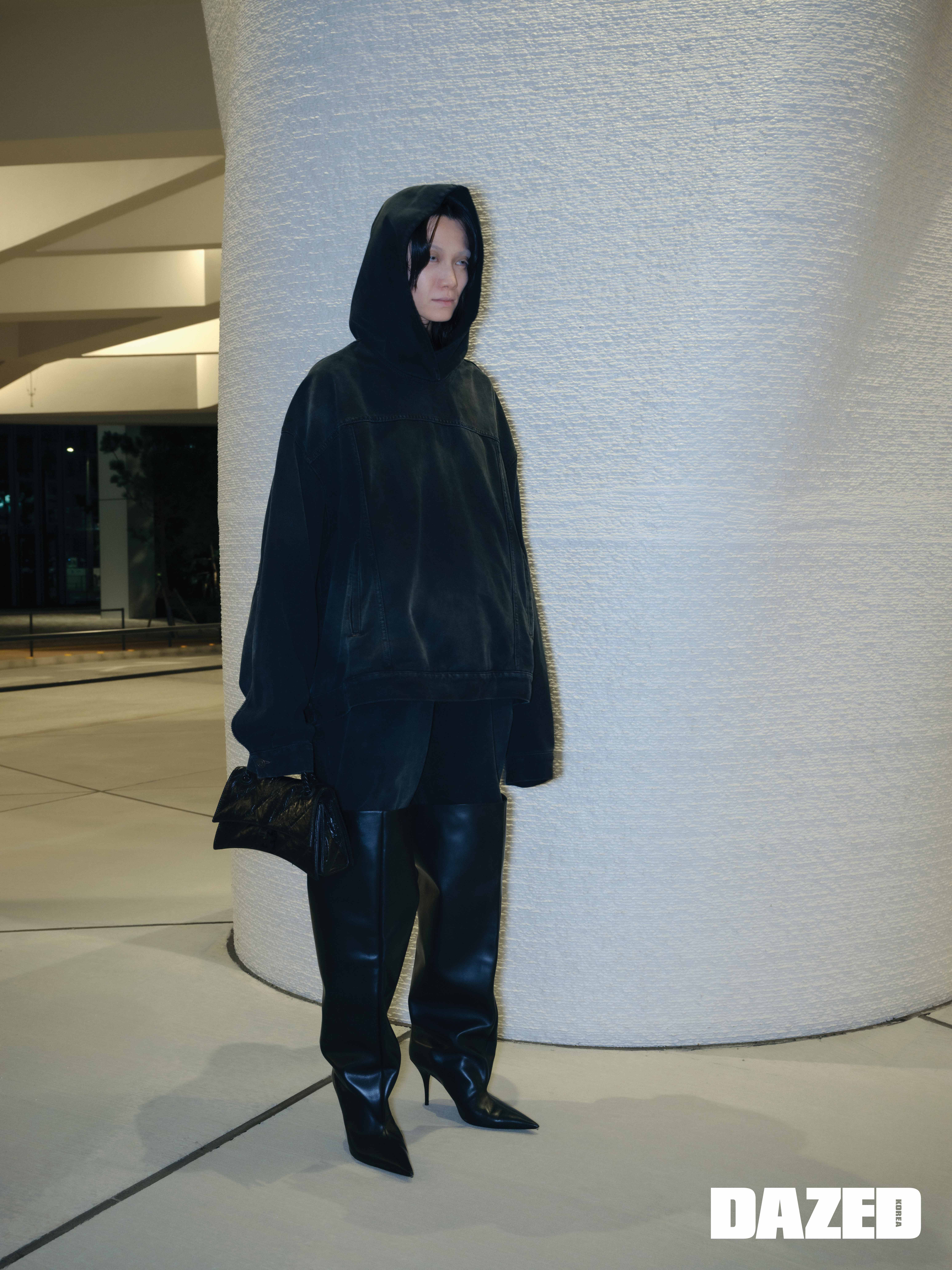 블랙 트위스트 라지 핏 재킷과 팬츠, 블랙 롱 부츠는 발렌시아가(Balenciaga).