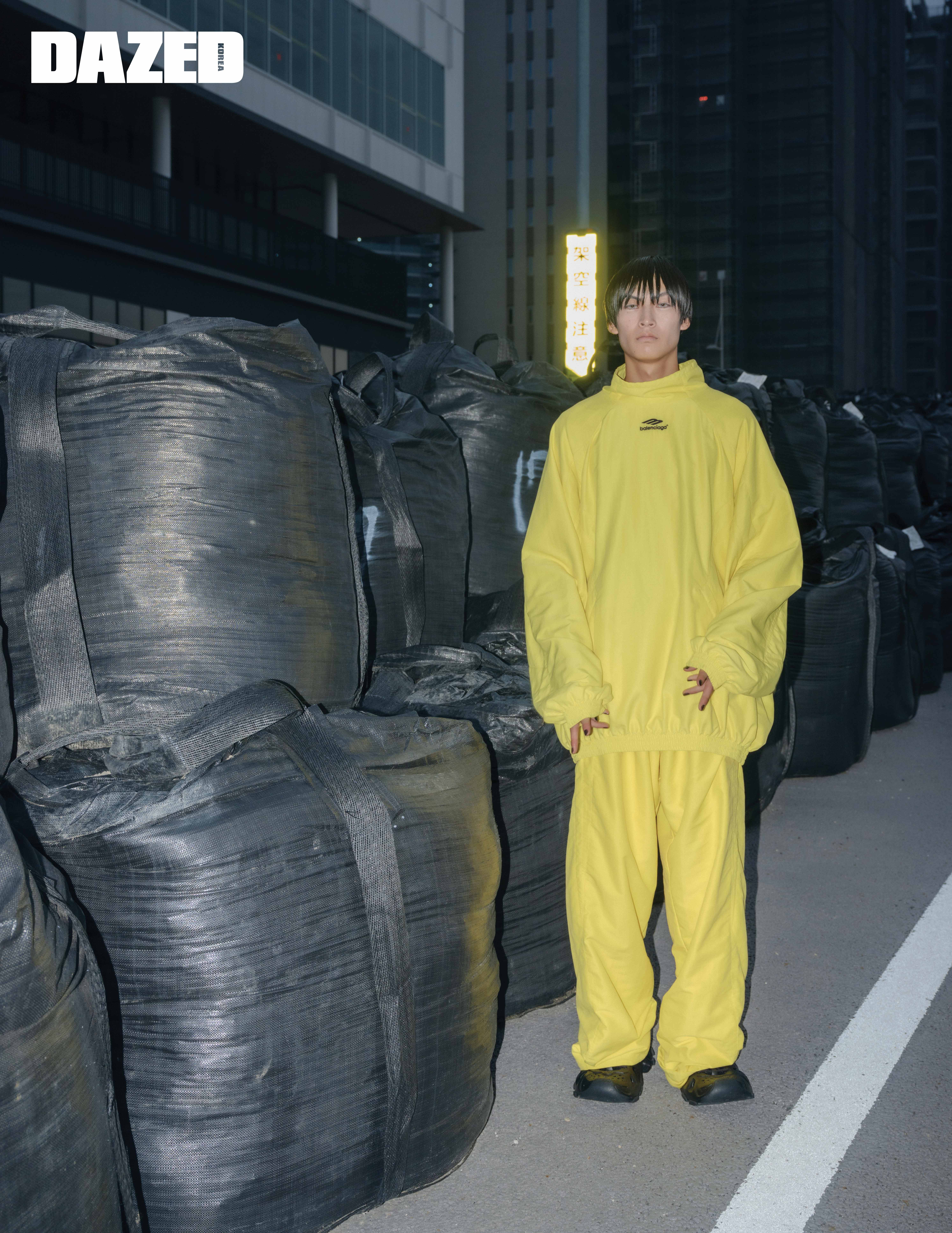 옐로우 풀오버 트랙 수트 재킷과 팬츠, 러버소재의 블랙 HD 스니커즈는 발렌시아가(Balenciaga).