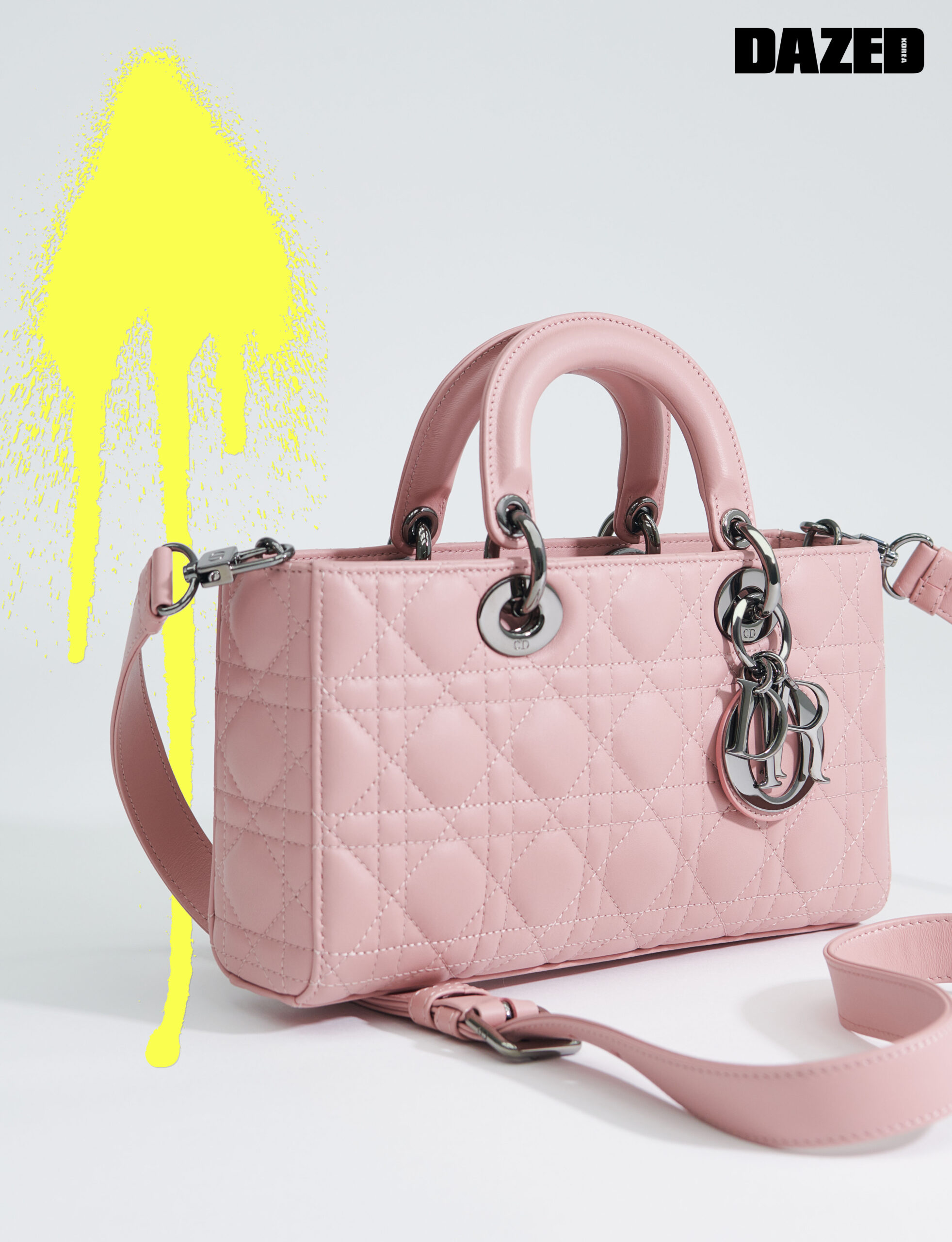 가로로 긴 형태의 핑크 양가죽 소재에 까나쥬 패턴을 새겨 넣은 레이디 디-조이(Lady D-Joy) 백은 디올(Dior).