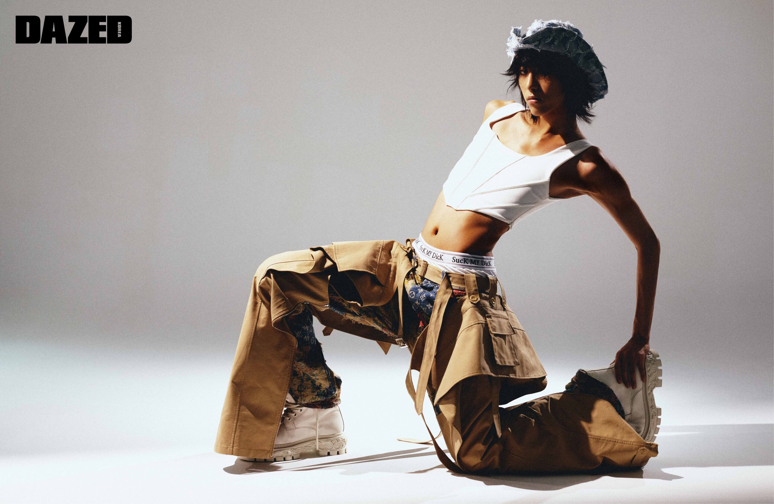 화이트 슬리브리스 톱은 자라(Zara), 디스트로이드 카펜터 데님 팬츠와 바로크 레인저 부츠는 루이 비통(Louis Vuitton), 레이어링한 베이지 슬릿 팬츠는 아드베스(Arts De Base), 이너로 입은 브리프는 떠그 클럽(Thug Club), 데님 카우보이 해트는 고로 고라(Gorro Gorra).