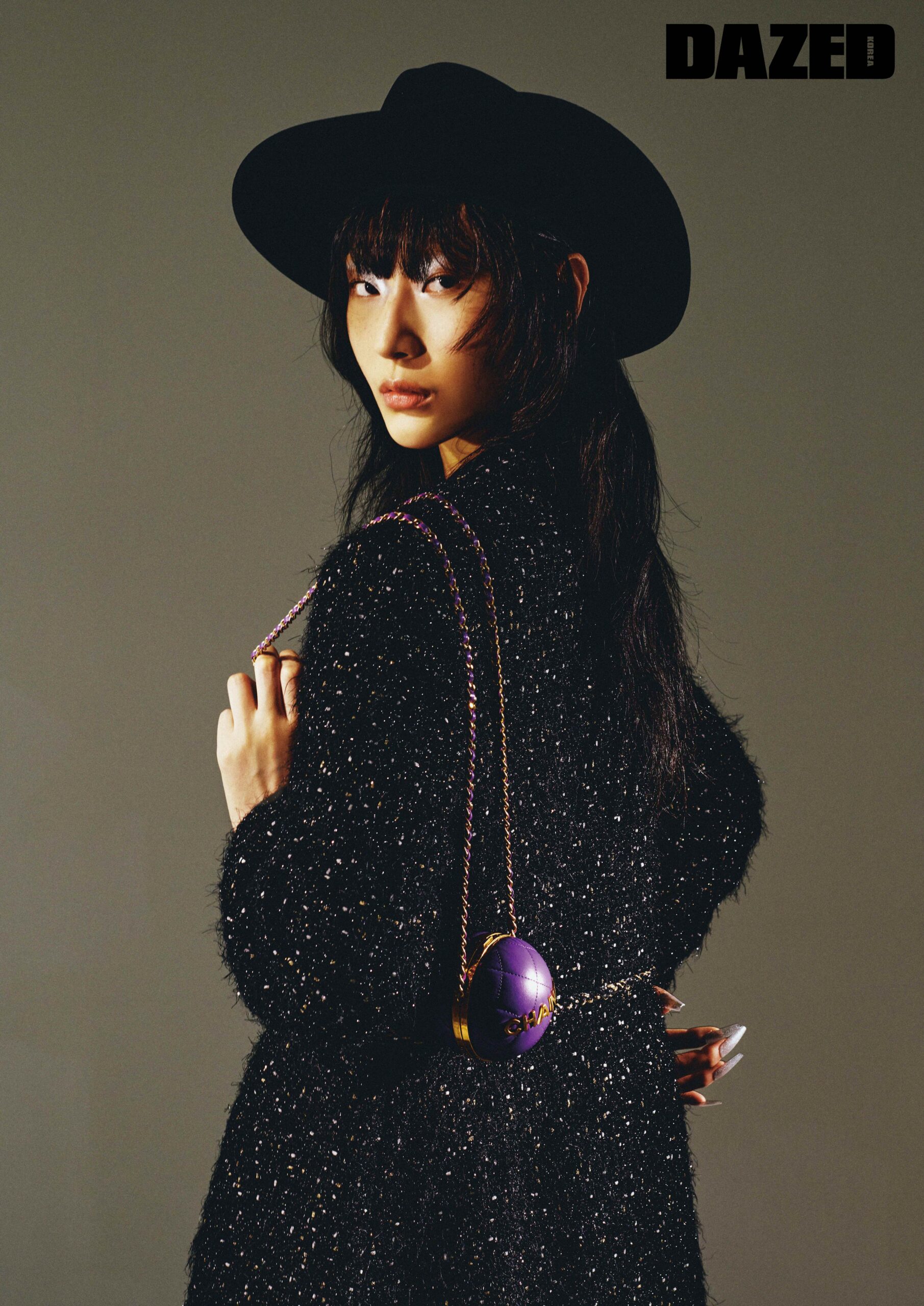 이리디센터 트위드 소재 코트와 메탈 스트라스 소재 벨트, 램스킨 미노디에르 백은 모두 샤넬(Chanel), 카우보이 펠트 해트는 구찌(Gucci).