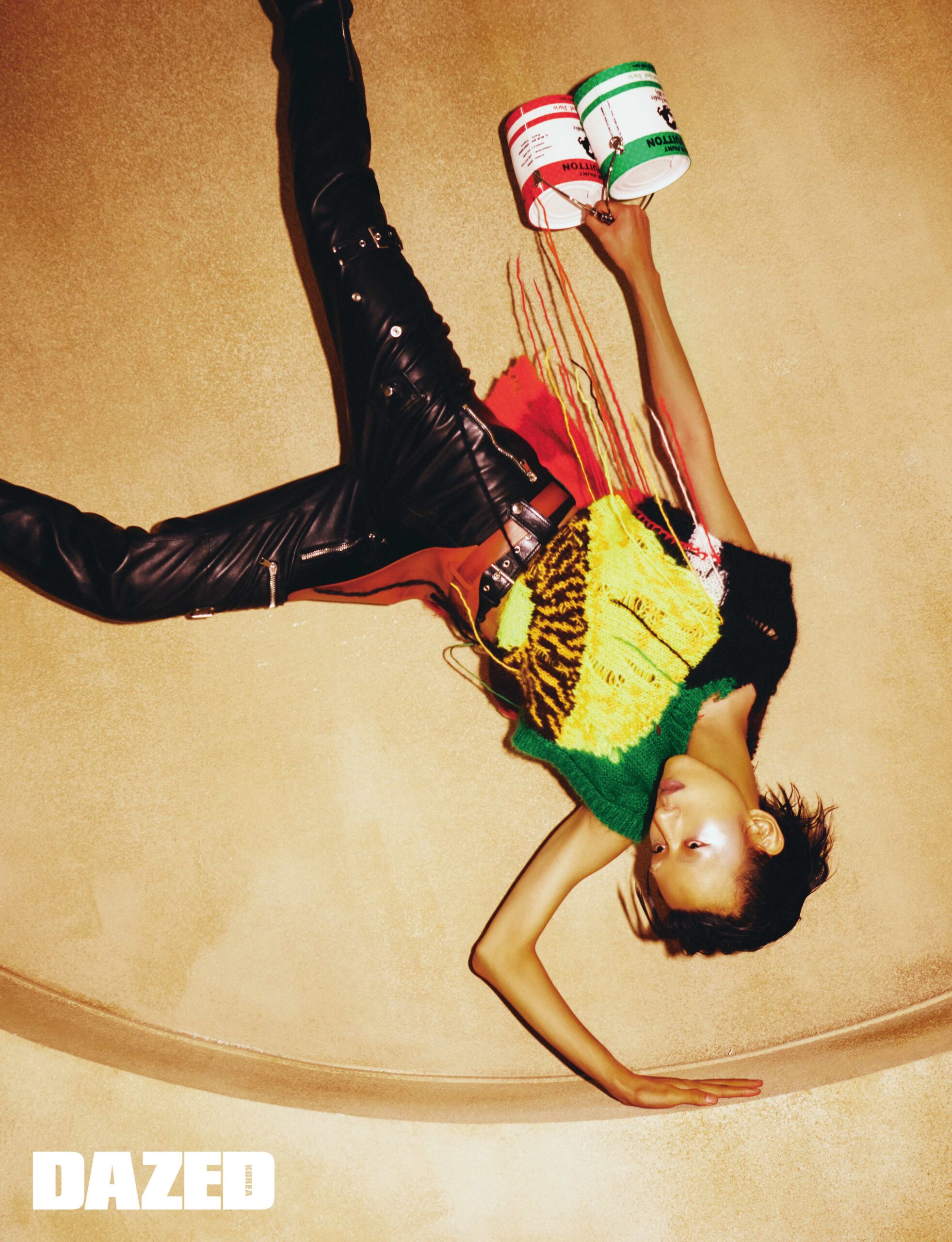 디스트로이드 멀티컬러 니트와 버클 디테일의 레더 팬츠는 알렉산더 맥퀸(Alexander McQueen), 팬츠에 레이어링한 벨트는 펜디(Fendi), 페인트 버킷 셰이프 백은 루이 비통(Louis Vuitton).