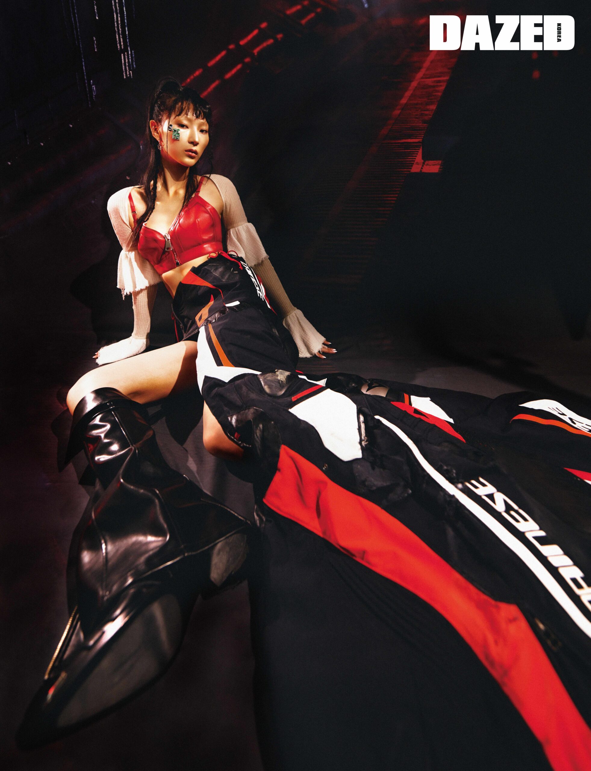 지퍼 디테일 뷔스티에와 버클 장식 앵클부츠는 알렉산더 맥퀸(Alexander McQueen), 러플 디테일 슬리브는 기준(Kijun), 허리에 묶어 연출한 레이싱 재킷 드레스는 티비오에스(T.B.O.S), 로라이즈 데님 미니스커트는 페인오어플레져(Pain or Pleasure), 레더 레그 워머는 아드베스(Arts de Base).