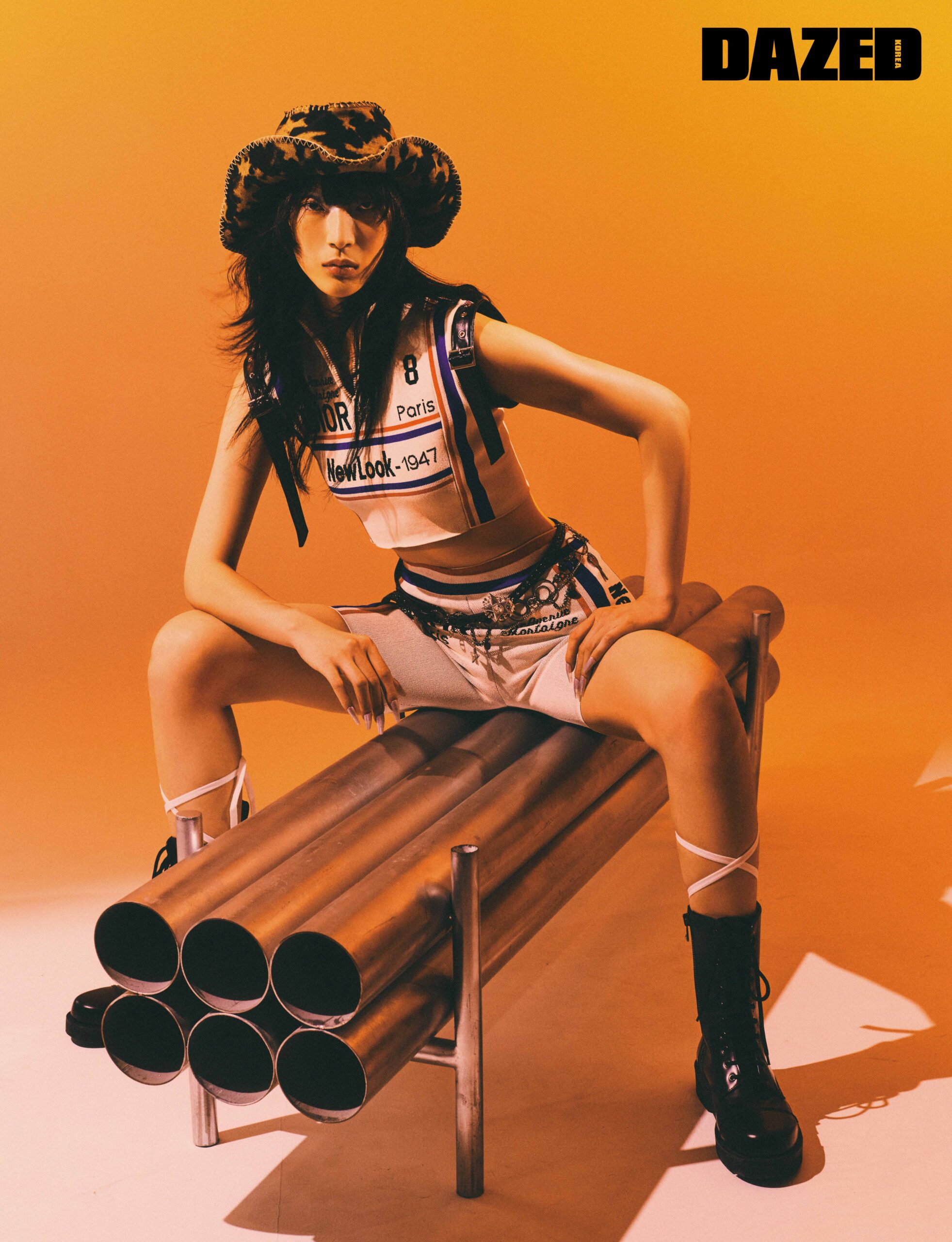 배색 스트라이프가 특징인 크롭트 톱과 사이클링 쇼츠, 메탈 아일릿 벨트, 벨트에 끼워 연출한 별 브로치는 모두 디올(Dior), 컴뱃 부츠는 발렌티노 가라바니(Valentino Garavani), 패턴 카우보이 해트는 고로 고라(Gorro Gorra), 어깨에 연출한 벨트는 아드베스(Arts De Base), 메탈 벨트와 스트랩 디테일의 삭스는 에디터의 것.