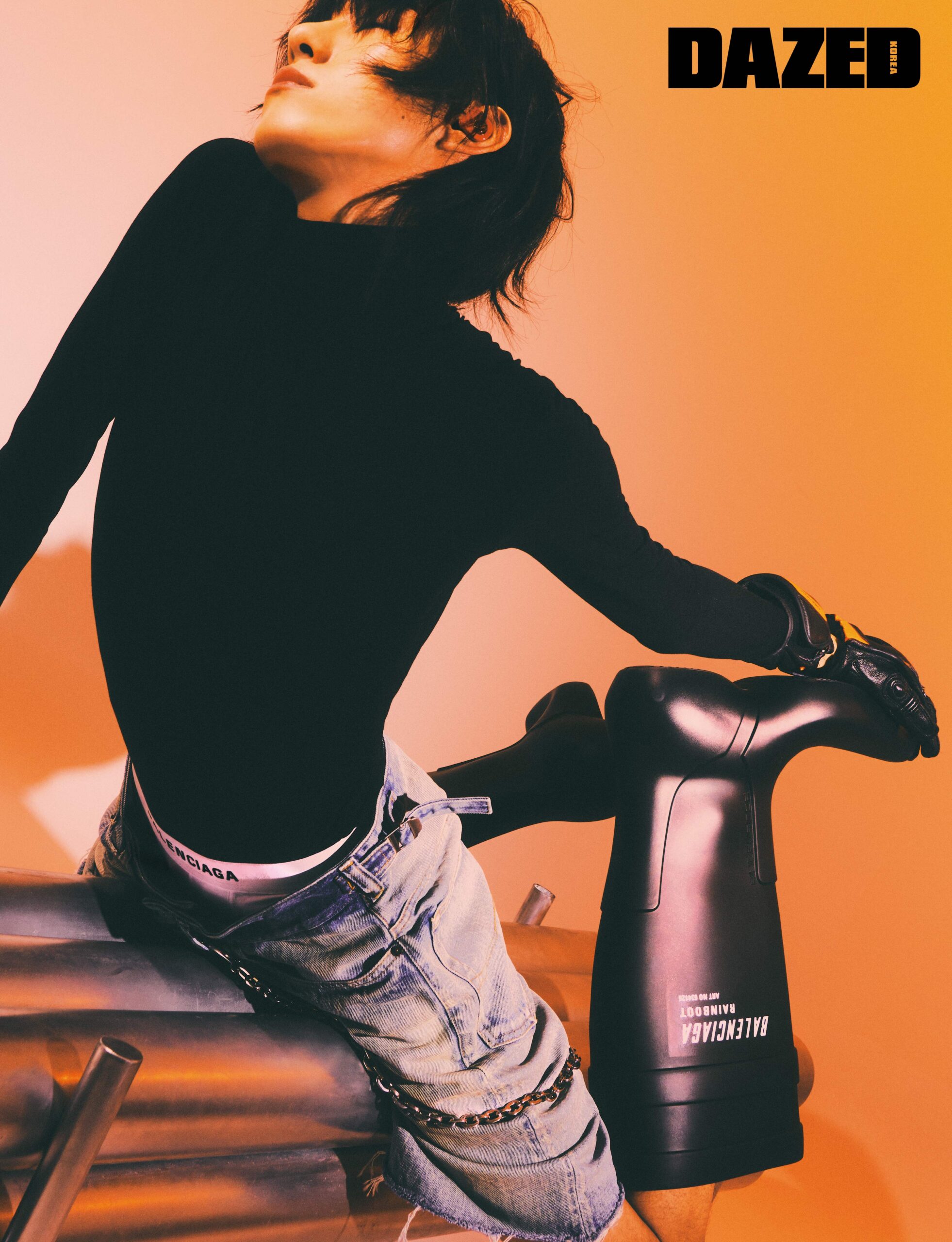터틀넥 롱 슬리브 톱과 스케이터 쇼츠, 복서 브리프, 러버 레인 부츠, 벨트 루프에 연출한 체인은 모두 발렌시아가(Balenciaga), 레이싱 글러브는 티비오에스(T.B.O.S).