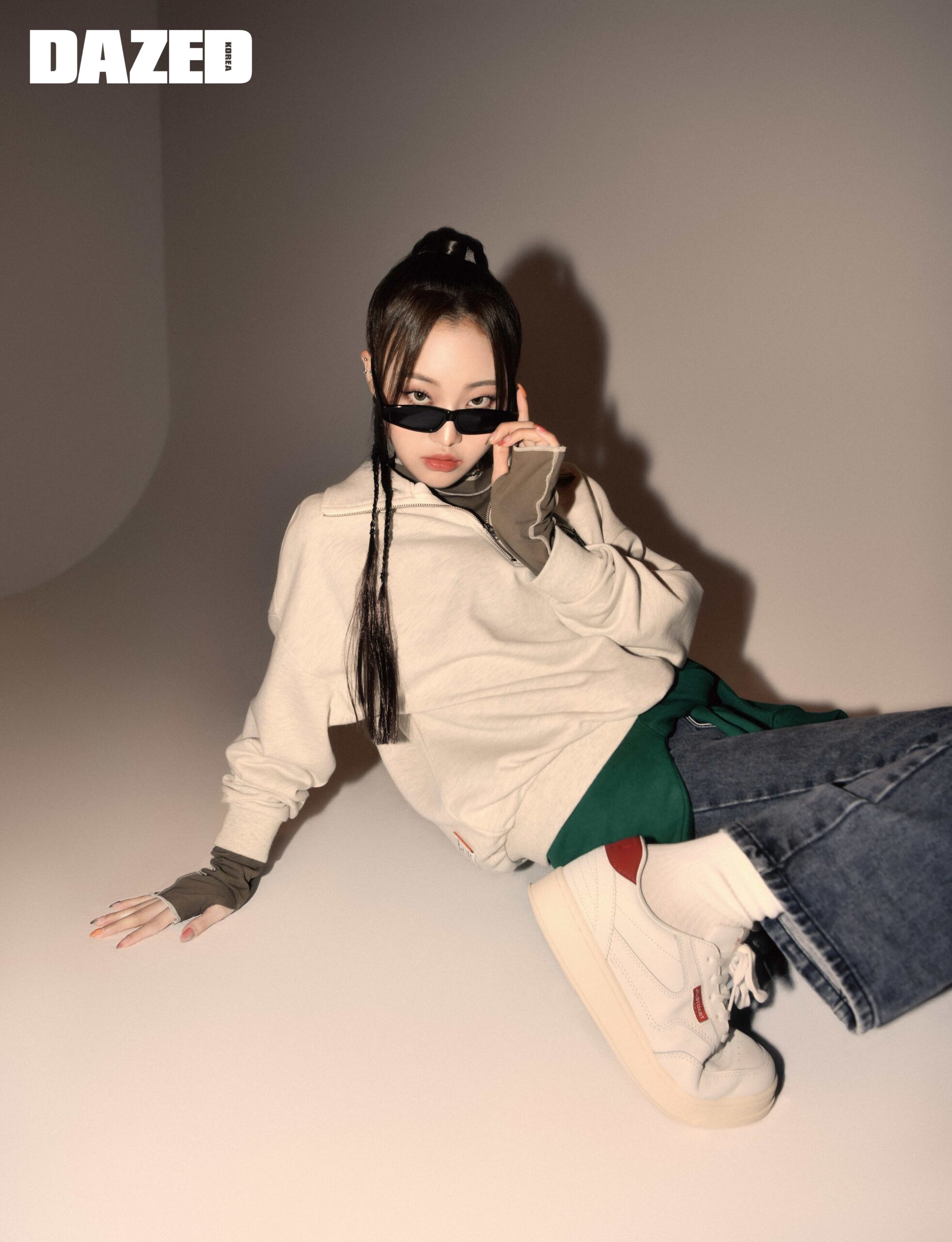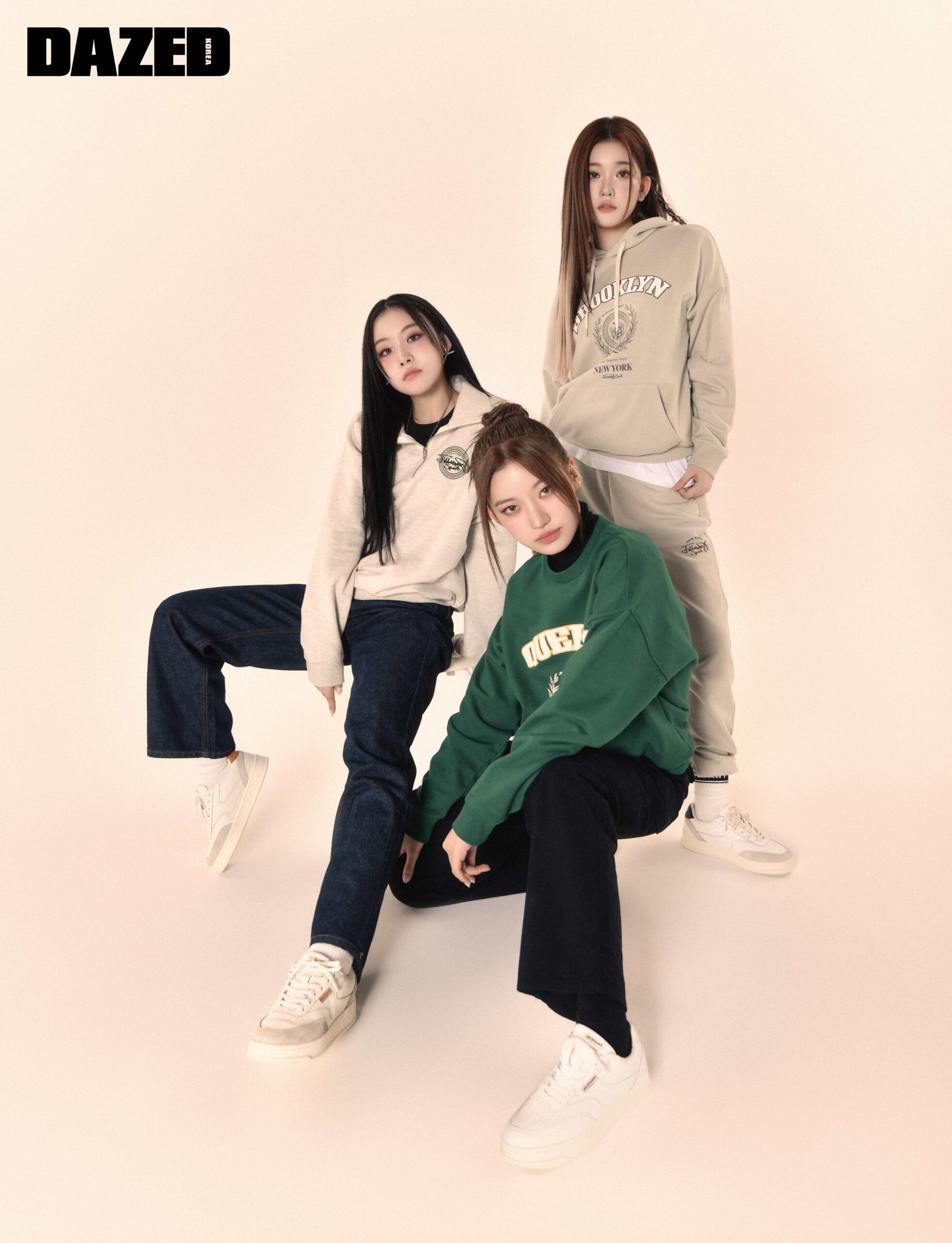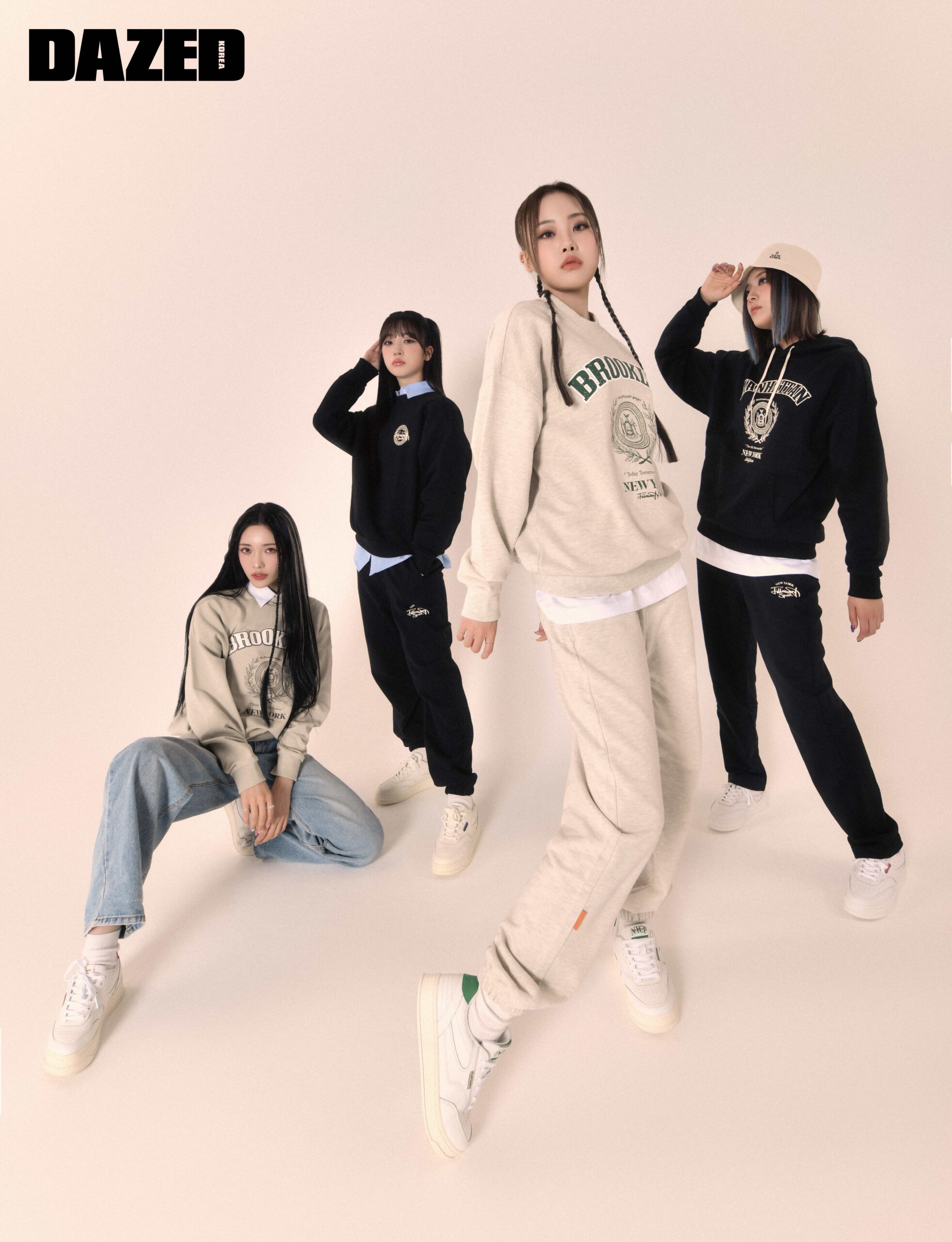 하람이 입은 뉴욕 시티 빅 로고가 돋보이는 그레이시 카키 유니 클래식 스웨트셔츠와 NYCP 클래식 가죽 스니커즈는 질스튜어트 스포츠(Jillstuart Sport), 화이트 셔츠와 데님 팬츠, 체인 네크리스, 삭스는 모두 에디터의 것. 하루나가 입은 스몰 엠블럼 로고가 특징인 블랙 유니 스웨트셔츠와 조거 팬츠, 네이비 컬러 배색이 돋보이는 NYCP 클래식 가죽 스니커즈는 질스튜어트 스포츠(Jillstuart Sport), 셔츠는 자라(Zara). 이 입은 뉴욕 시티 빅 로고가 돋보이는 오트밀 멜란지 컬러의 유니 스웨트셔츠와 이너로 착용한 화이트 티셔츠, 스몰 로고가 특징인 오트밀 멜란지 컬러의 조거 팬츠, 그린 컬러 배색이 돋보이는 NYCP 클래식 가죽 스니커즈는 모두 질스튜어트 스포츠(Jillstuart Sport). 문수아가 입은 뉴욕 시티 빅 로고가 돋보이는 블랙 유니 클래식 후드 톱과 이너로 착용한 화이트 티셔츠, 스몰 로고가 특징인 블랙 유니 스웨트팬츠, NYCP 클래식 화이트 가죽 스니커즈, 베이지 버킷 해트는 모두 질스튜어트 스포츠(Jillstuart Sport).