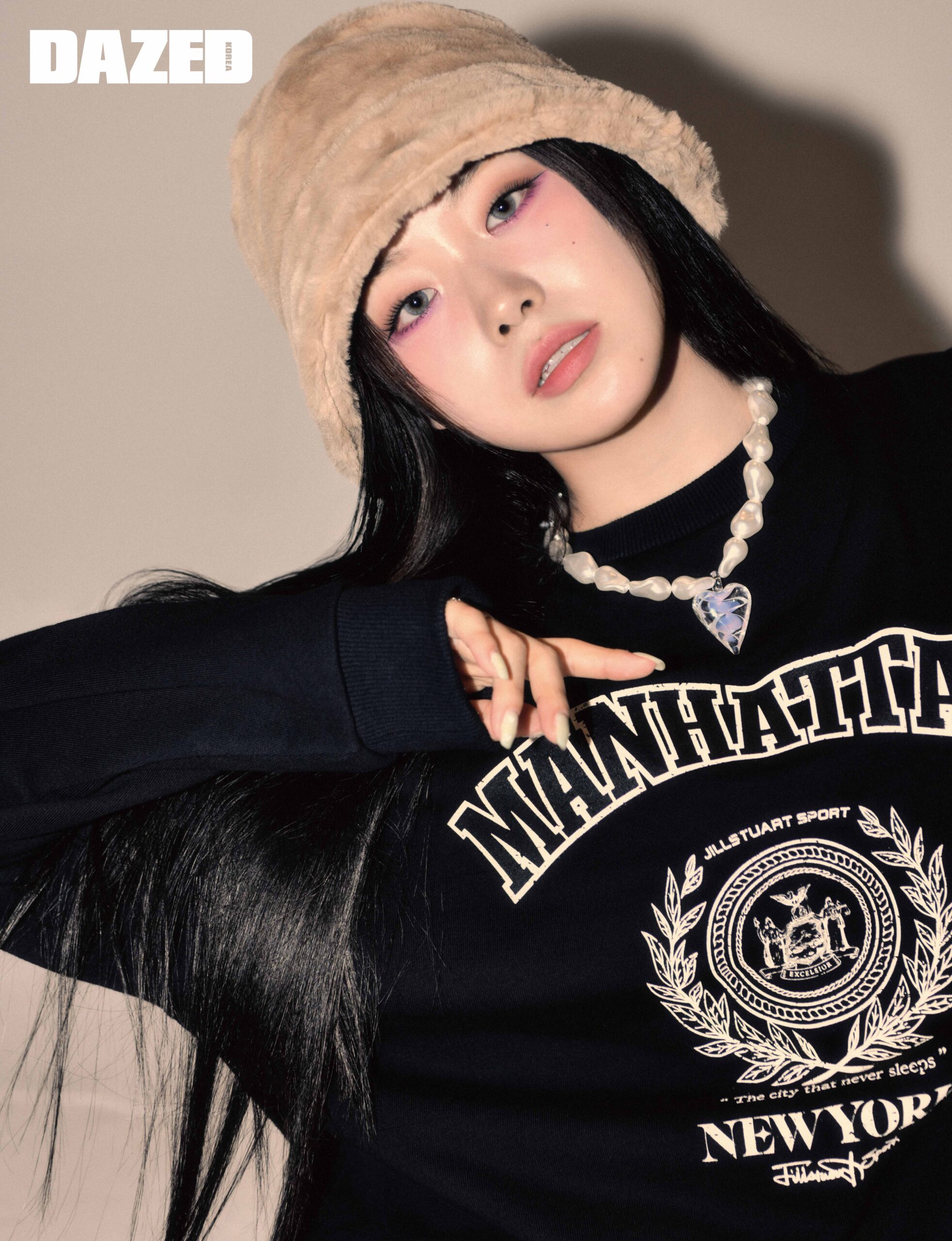 뉴욕 시티 빅 로고가 특징인 블랙 클래식 스웨트셔츠는 질스튜어트 스포츠(Jillstuart Sport), 퍼 버킷 해트와 펄 네크리스는 에디터의 것.