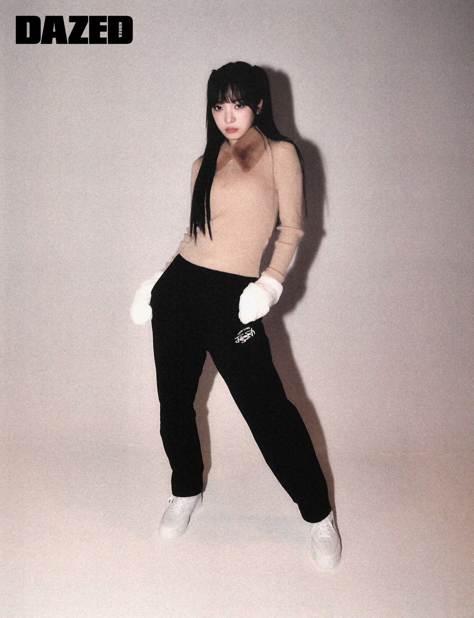 하루나가 입은 스몰 로고가 특징인 블랙 유니 스웨트팬츠와 NYCP 클래식 화이트 가죽 스니커즈는 질스튜어트 스포츠(Jillstuart Sport), 톱은 자라(Zara), 퍼 글러브는 에디터의 것.