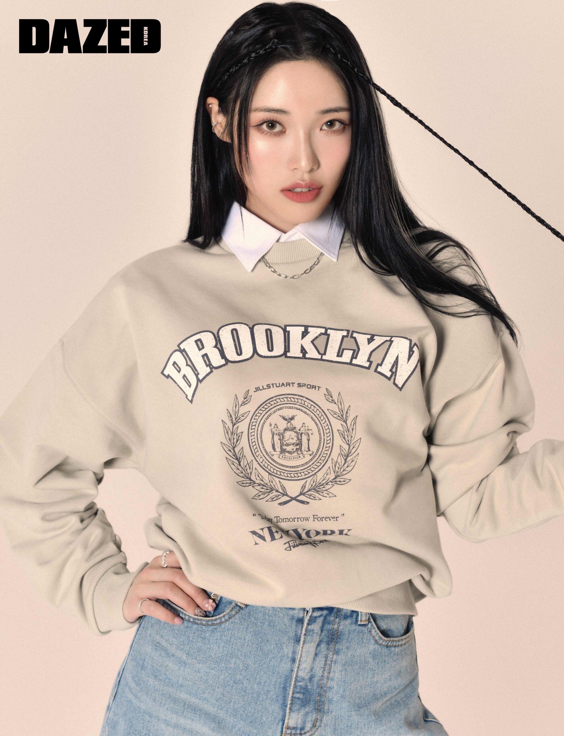 뉴욕 시티 빅 로고 포인트의 그레이시 카키 스웨트셔츠는 질스튜어트 스포츠(Jillstuart Sport), 이너로 입은 화이트 셔츠와 데님 팬츠, 체인 네크리스는 모두 에디터의 것.