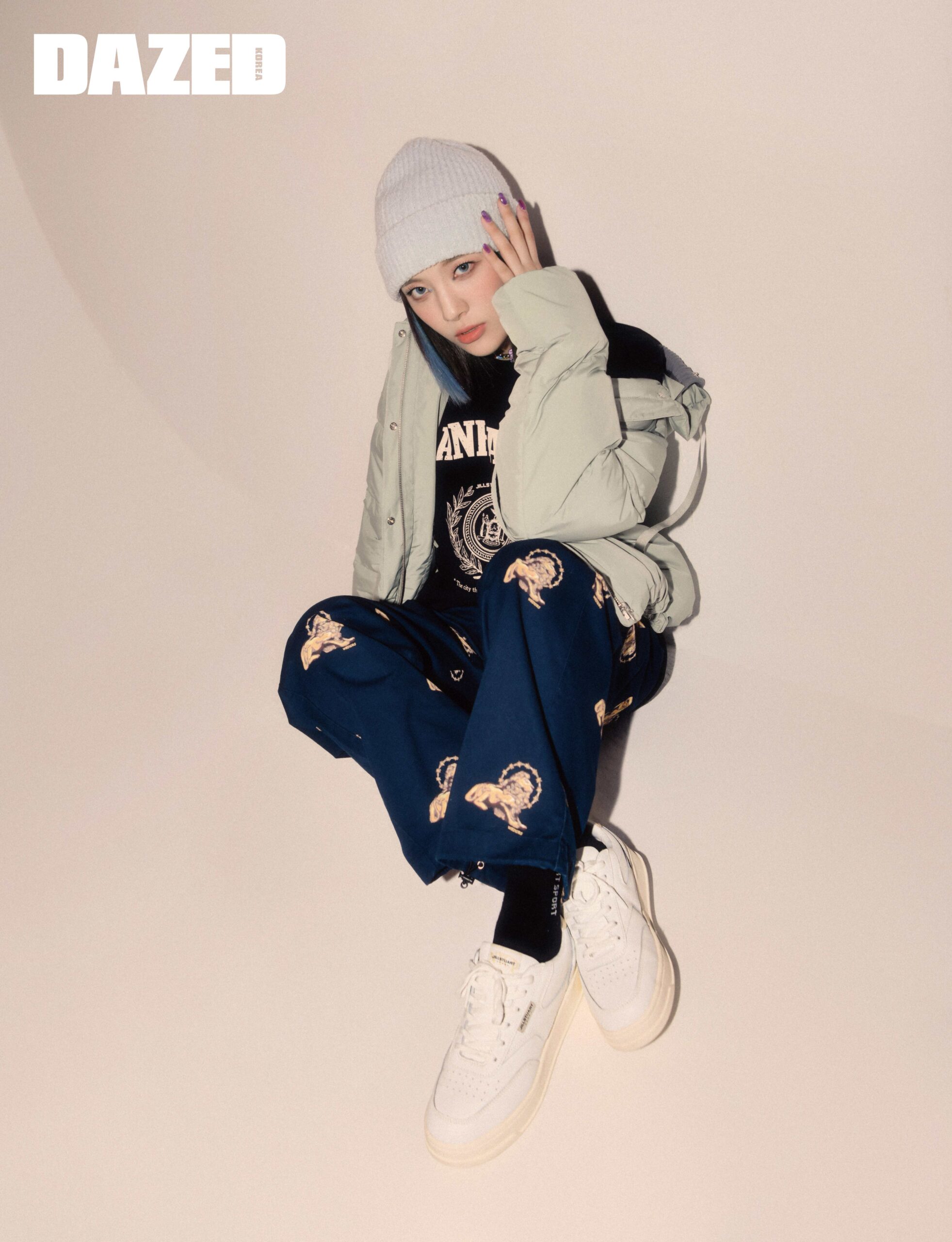 소프트 웜 니트 포인트의 후드 쇼트 구스다운 재킷과 뉴욕 시티 빅 로고가 특징인 블랙 티셔츠, 크림 컬러 배색이 돋보이는 NYCP 클래식 가죽 스니커즈, 블랙 로고 삭스는 모두 질스튜어트 스포츠(Jillstuart Sport), 비니는 앤아더스토리즈(& Other Stories), 팬츠는 위캔더스(WKNDRS), 비즈 네크리스는 트웬티원어거스트(Twentyoneaugust), 펄 네크리스는 스틸에디션(Steel Edition).