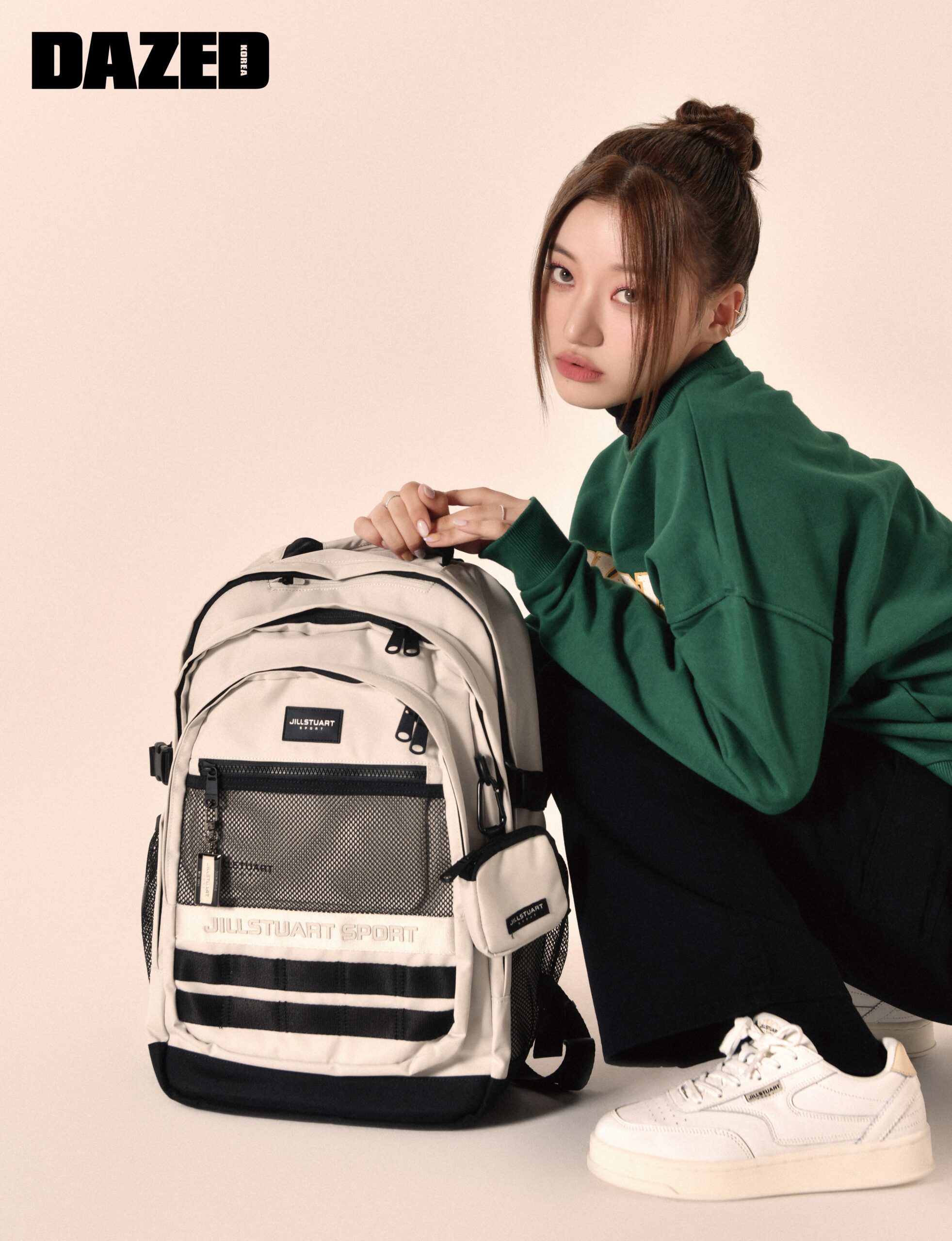 뉴욕 시티 빅 로고가 돋보이는 다크 그린 스웨트셔츠와 크림 컬러 배색이 돋보이는 NYCP 클래식 가죽 스니커즈, NY 스토리저 멀티 포켓 백팩은 모두 질스튜어트 스포츠(Jillstuart Sport), 블랙 터틀넥 톱과 팬츠, 삭스는 모두 에디터의 것.