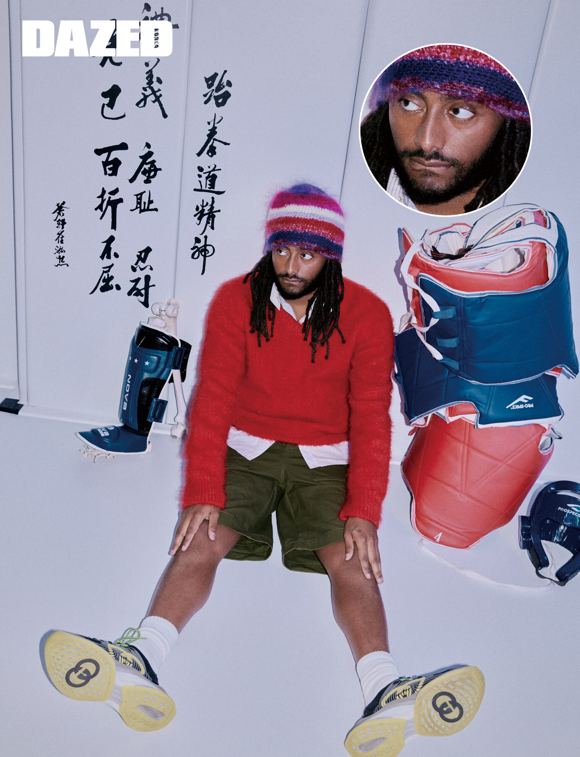 레드 울 모헤어 브이넥 니트 톱과 레이어링한 스트라이프 셔츠, 코튼 캔버스 쇼츠, 스니커즈는 모두 구찌(Gucci), 삭스와 비니는 에디터의 것.