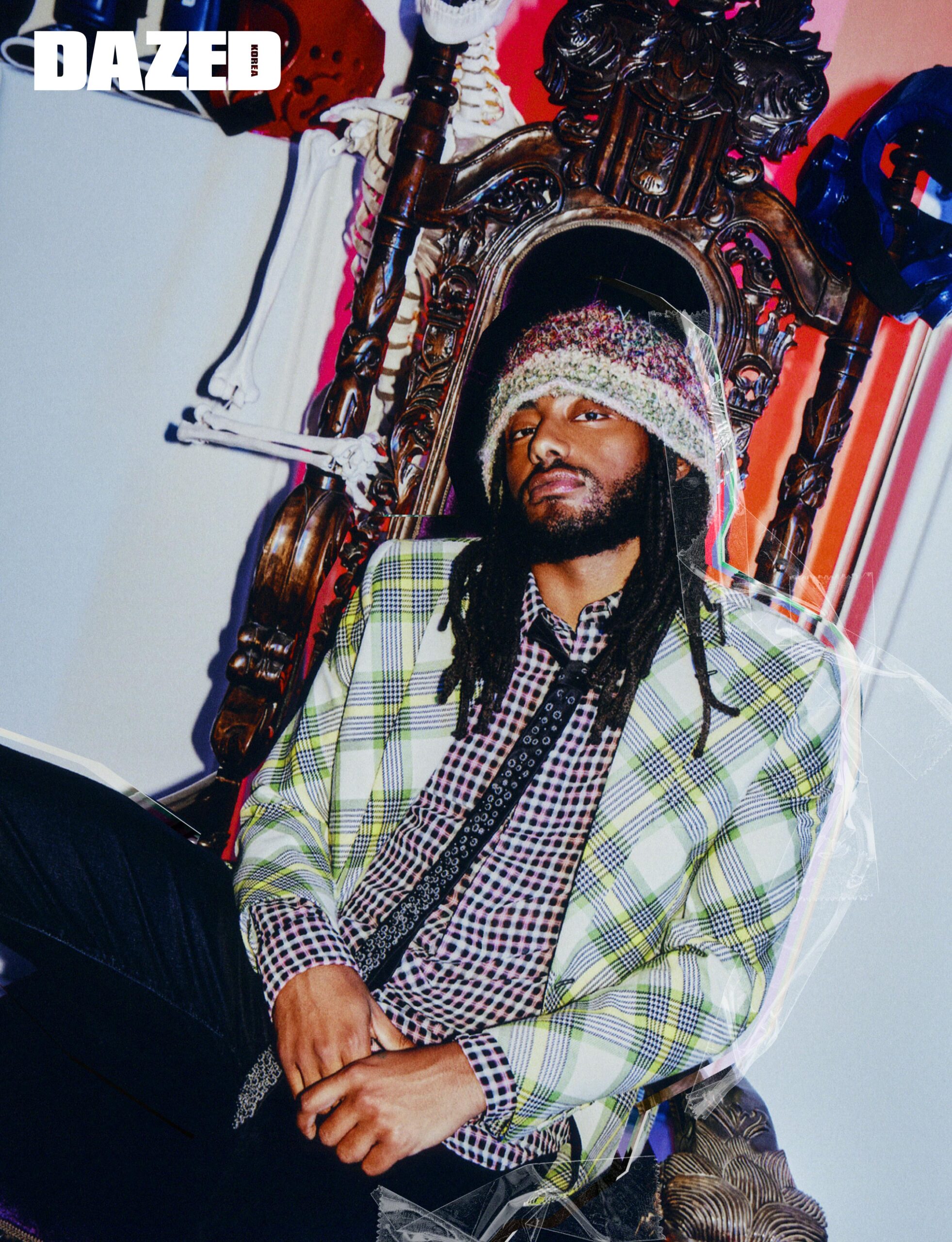 체크 패턴 재킷과 오픈워크 체크가 돋보이는 코튼 셔츠, 데님 팬츠, 큐빅 장식 타이는 모두 디올 (Dior Men), 비니는 에디터의 것.