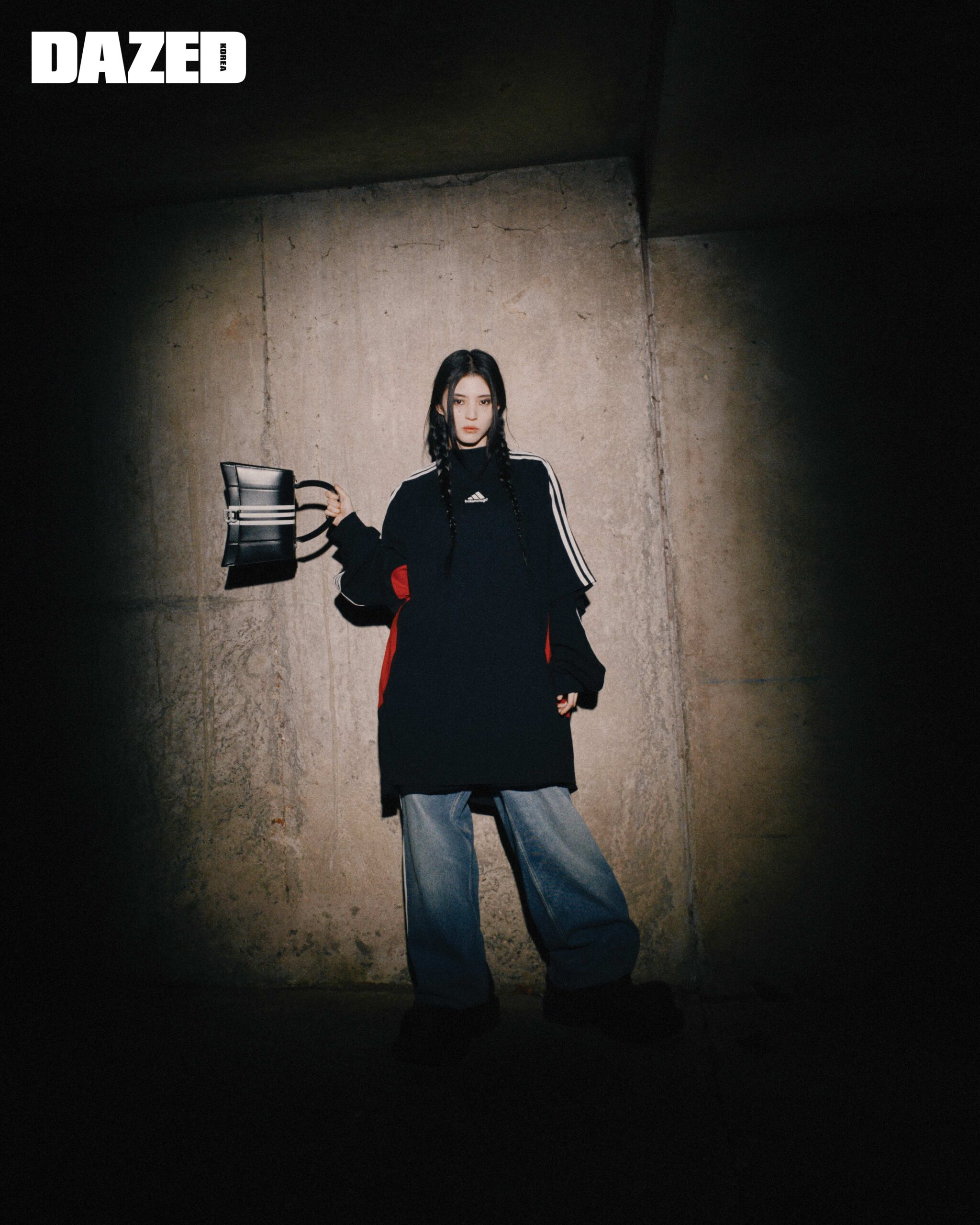 오버사이즈 티셔츠와 롱 슬리브 티셔츠, 라지 핏 배기팬츠, 아워글라스 톱 핸들 백은 모두 발렌시아가 / 아디다스(Balenciaga / adidas), 더비 슈즈는 발렌시아가(Balenciaga).