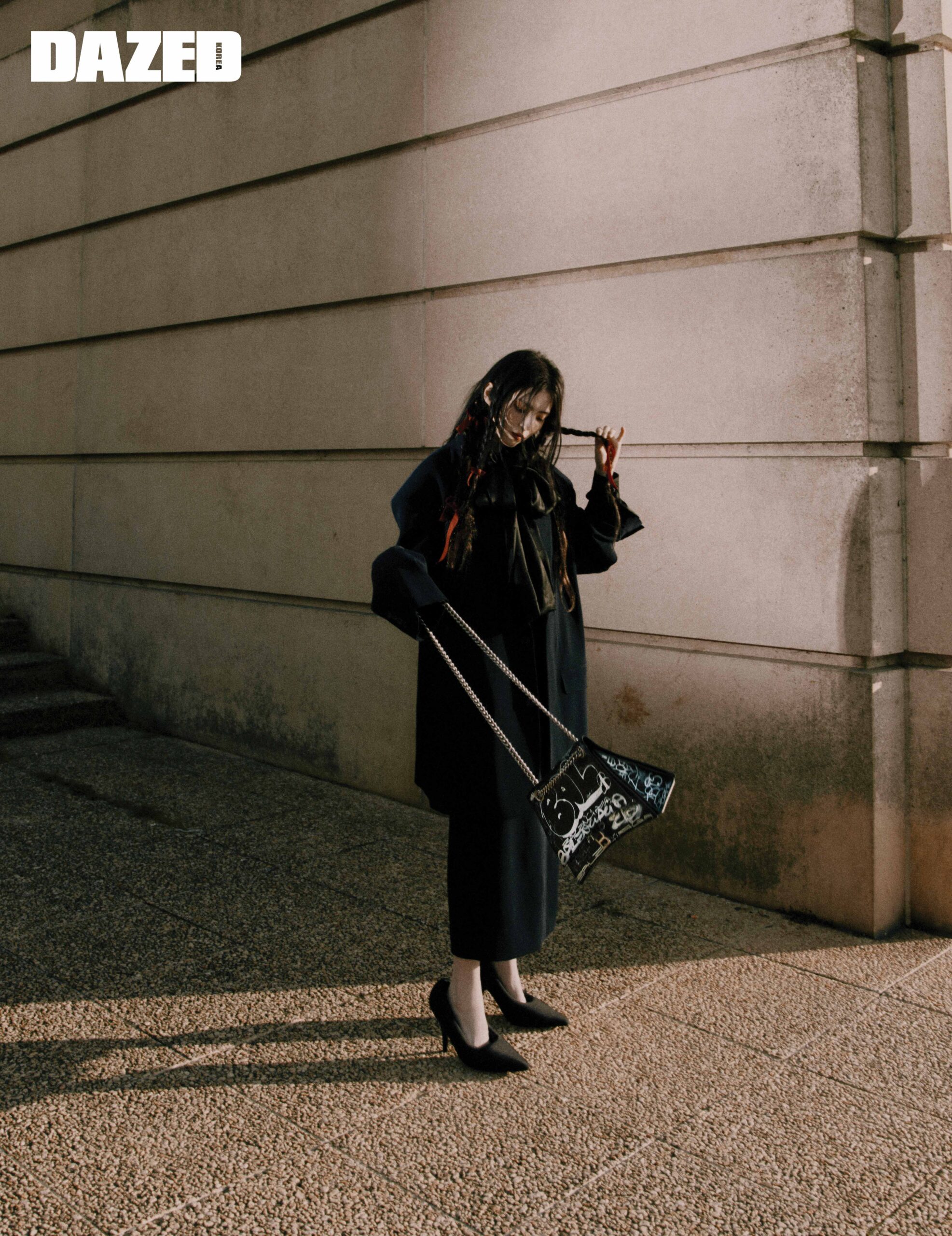 오버사이즈 SB 재킷과 후드 블라우스, 슬릿 테일러드 스커트, 펌프스는 모두 발렌시아가 가드로브(Balenciaga Garde-robe), 크러쉬 미디엄 체인 백 그라피티 버전은 발렌시아가(Balenciaga).