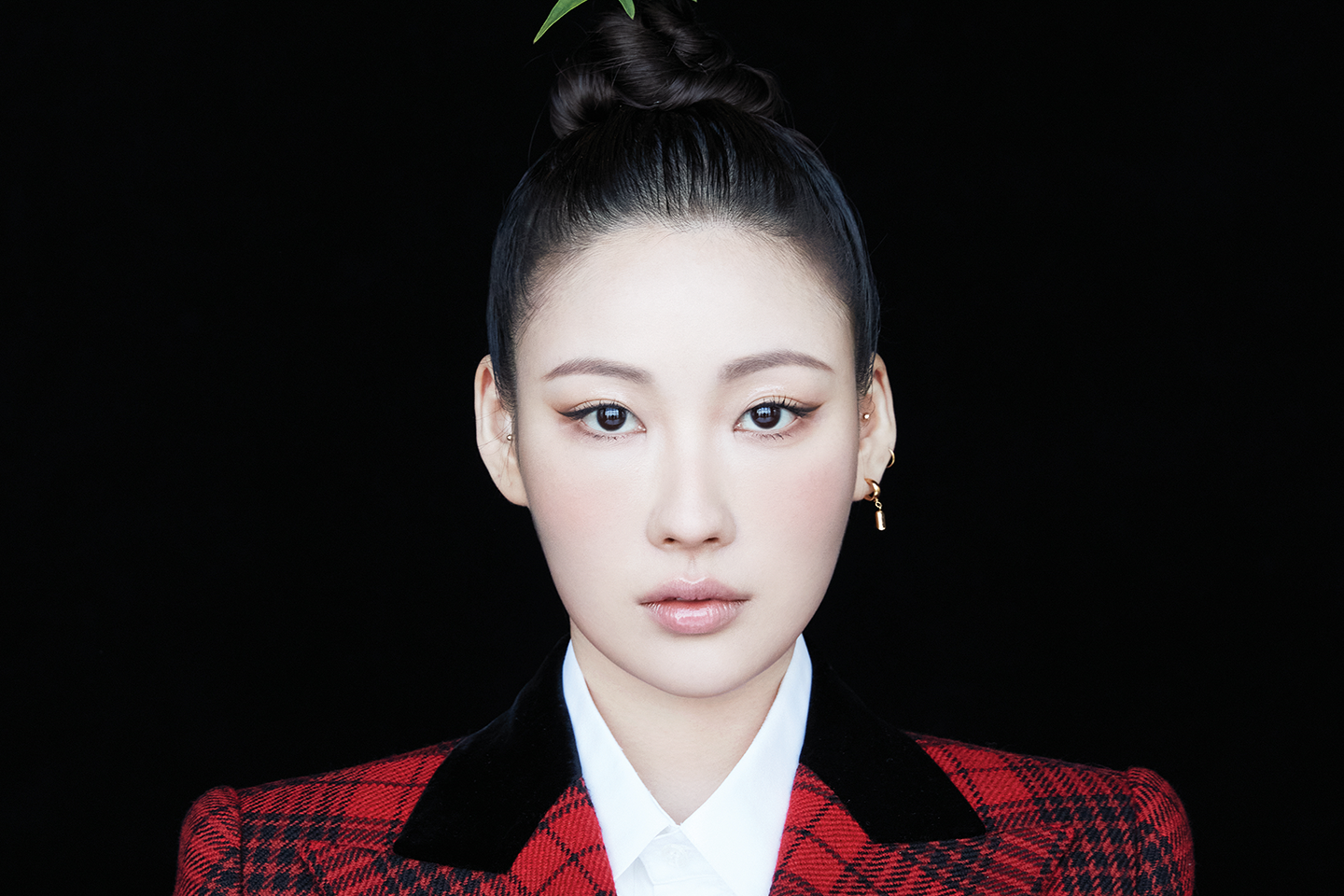 프린트 재킷과 셔츠는 알렉산더 맥퀸(Alexander McQueen), 크리스털 이어 커프와 실버 링 이어 커프는 포트레이트 리포트(Portrait Report), 실버 이어 커프는 써티투던(32DAWN), 블랙 레더 타이는 구찌(Gucci).