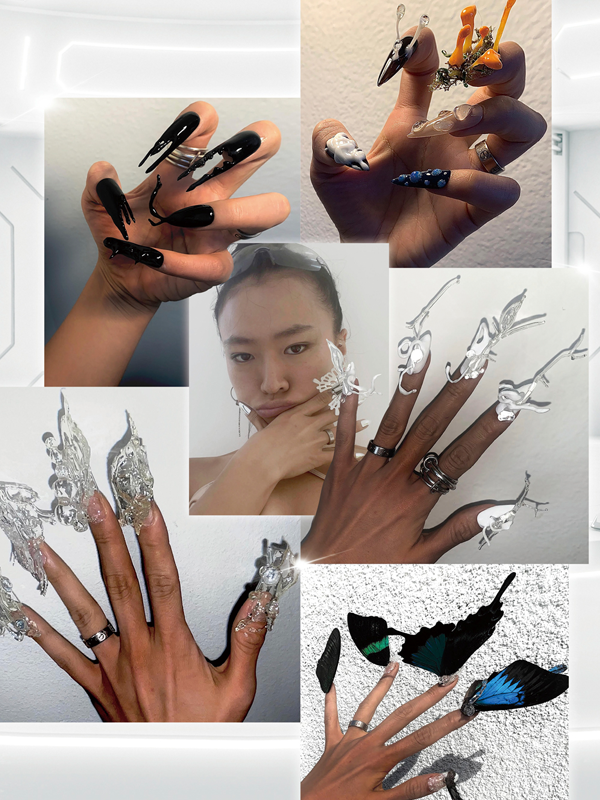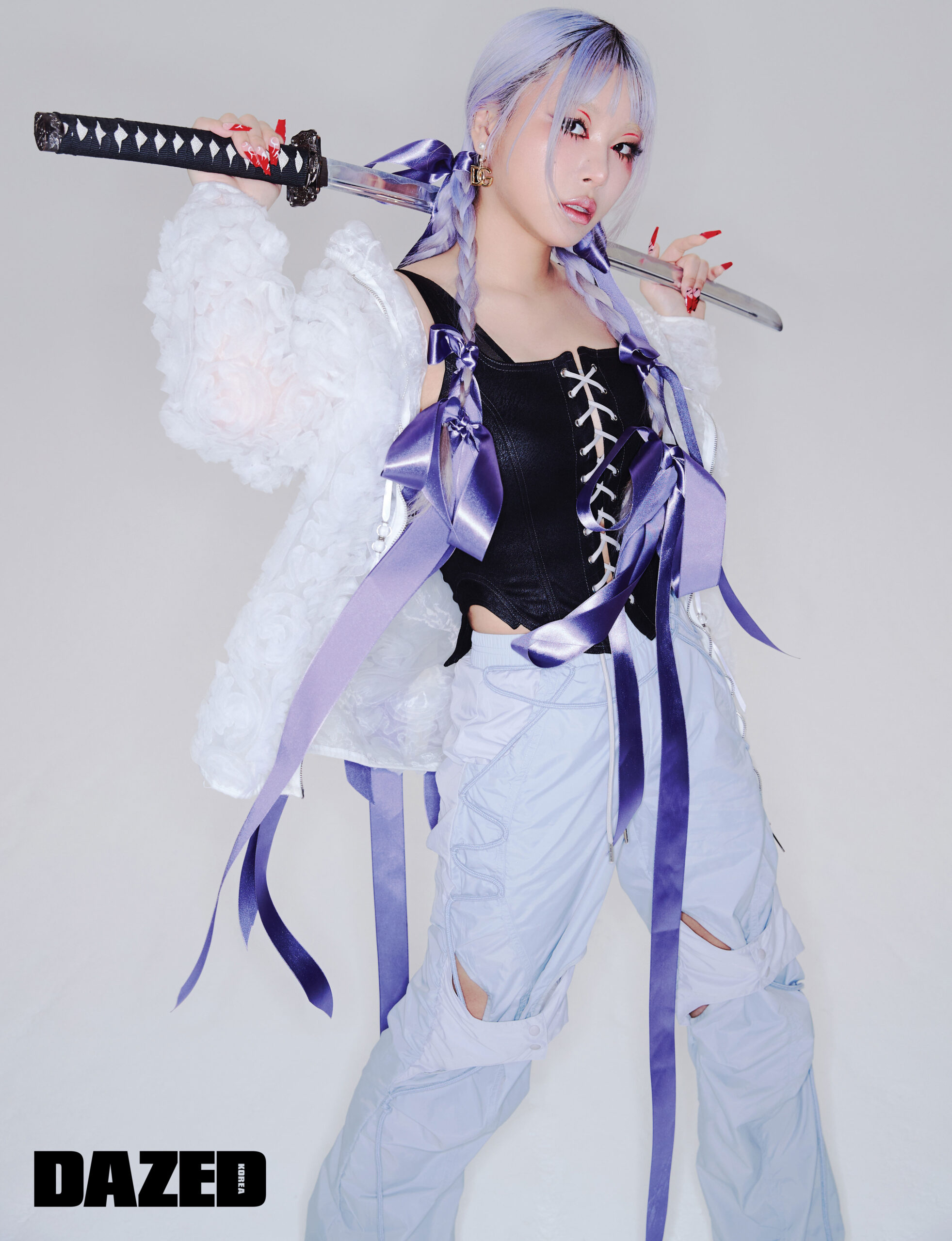 시폰 소재의 후드 집업 재킷은 나체(Nache), 코르셋 톱은 카시코(Kashiko), 스트링 디테일이 돋보이는 팬츠는 오호스(OJOS), 로고 골드 이어링은 돌체앤가바나(Dolce&Gabbana), 그래픽 디테일의 네일 팁은 트웨거(Tweggerz).