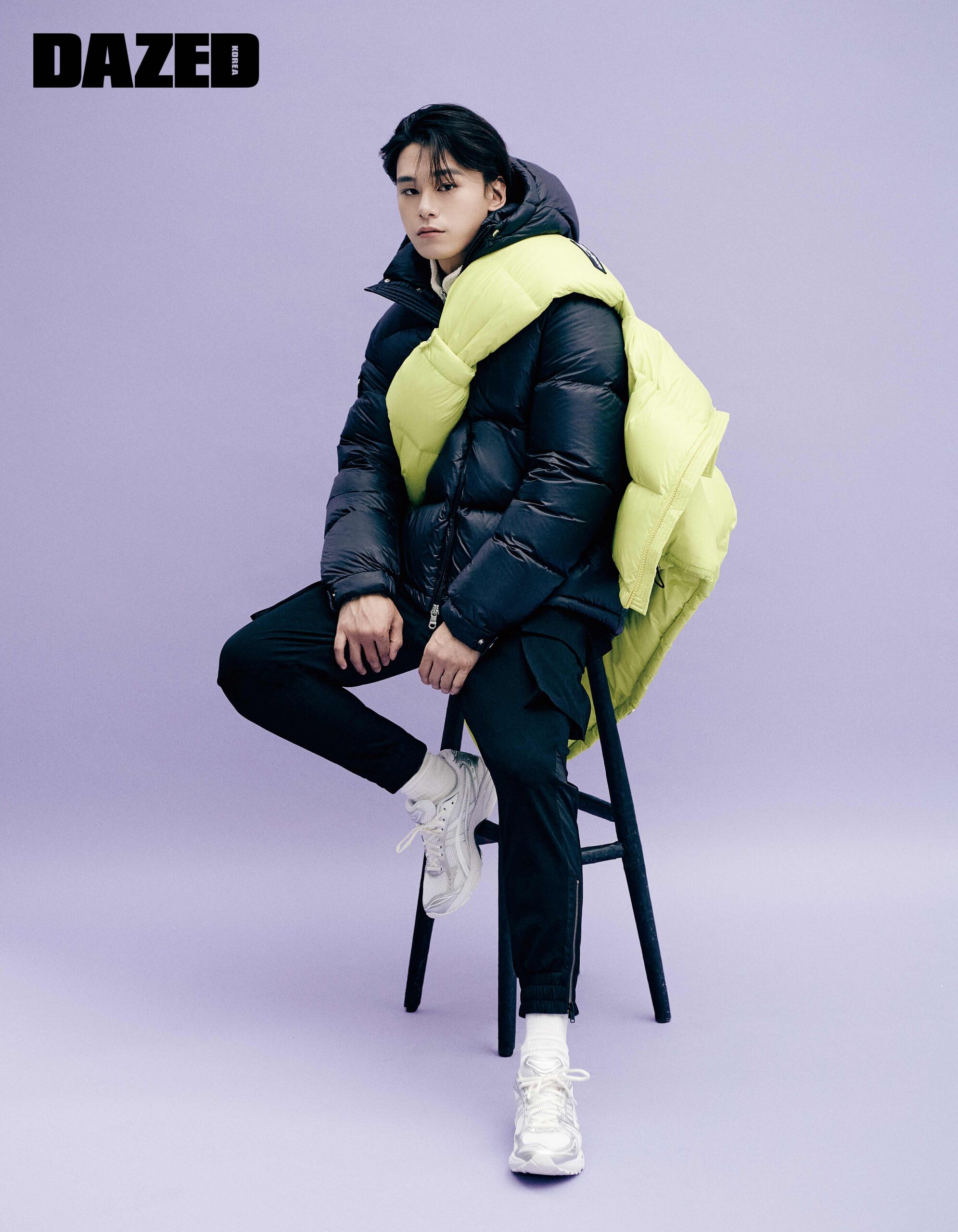 블랙 컬러의 패딩 스캇 재킷과 레이어링한 옐로 컬러의 패딩 스캇 재킷은 화이트스페이스 by 플라즈(White:Space by PLADS7), 이너로 입은 던칸 파일 하프 집업 스웨트셔츠는 르 두 by 플라즈(Les Deux by PLADS7), 조거 팬츠는 티아이포맨(T.I FOR MEN).