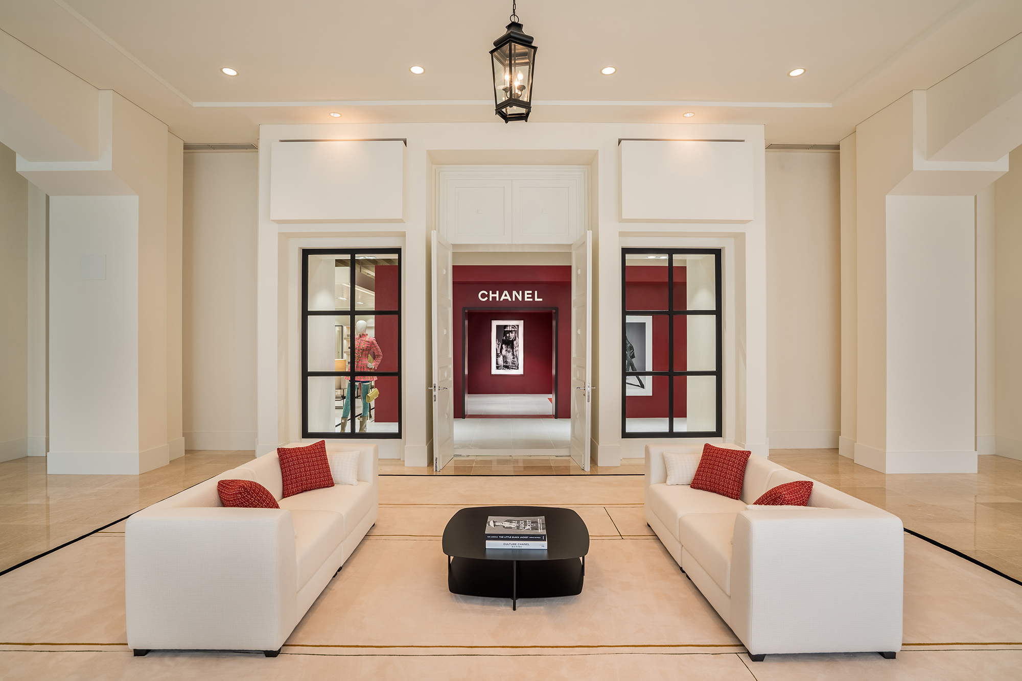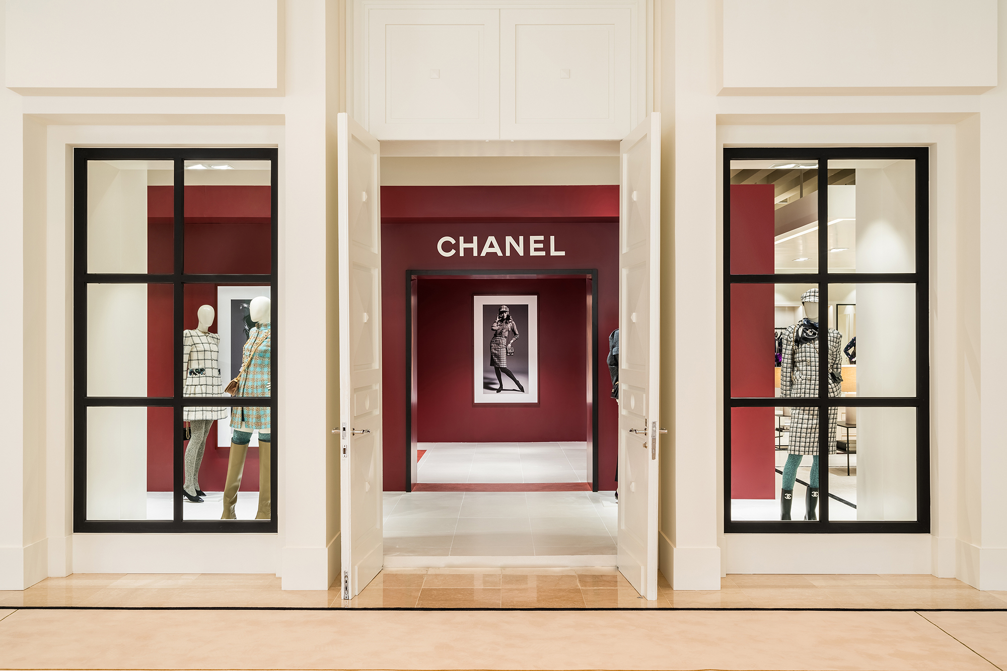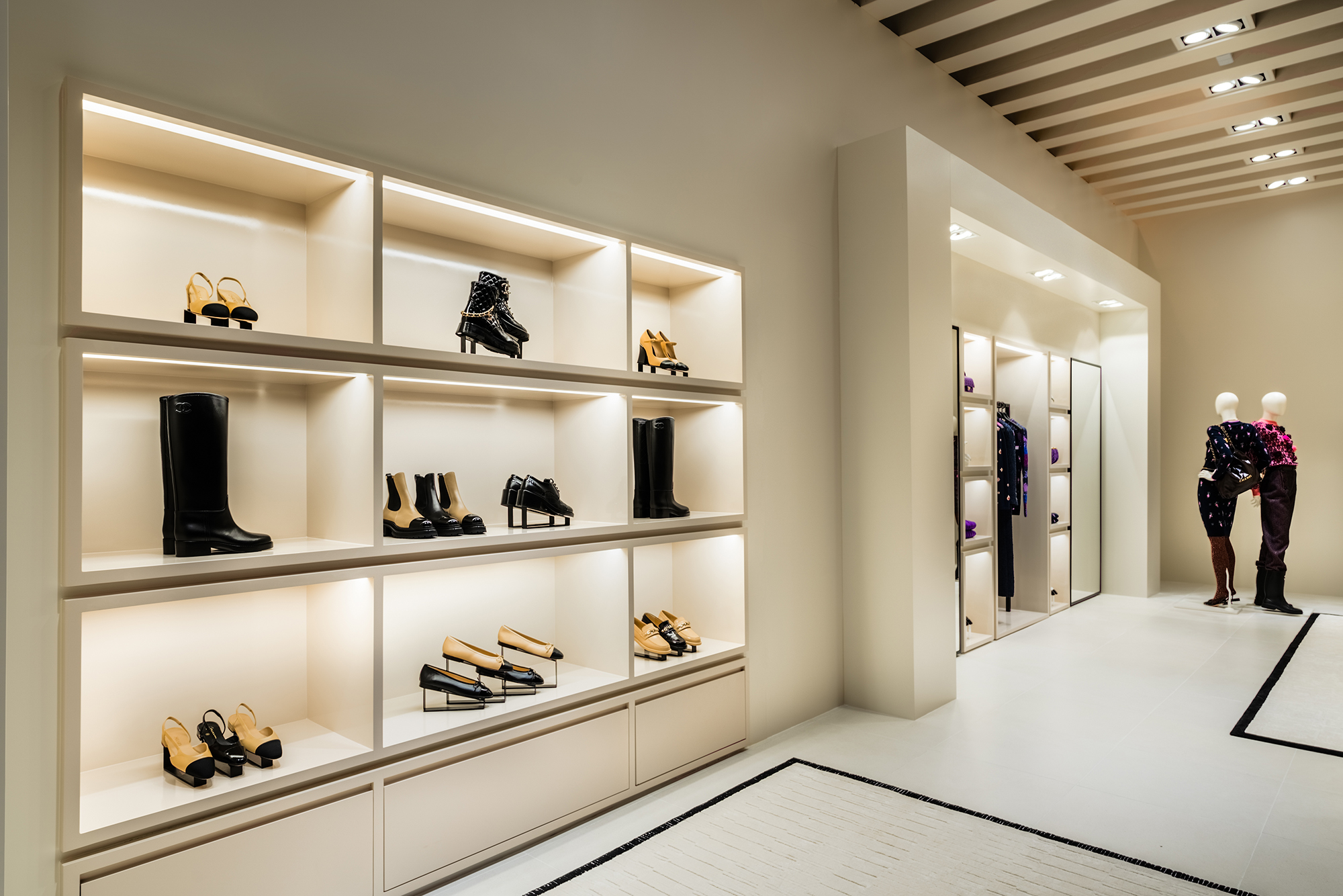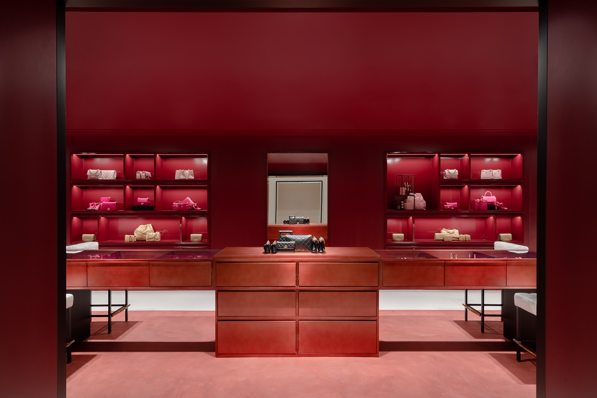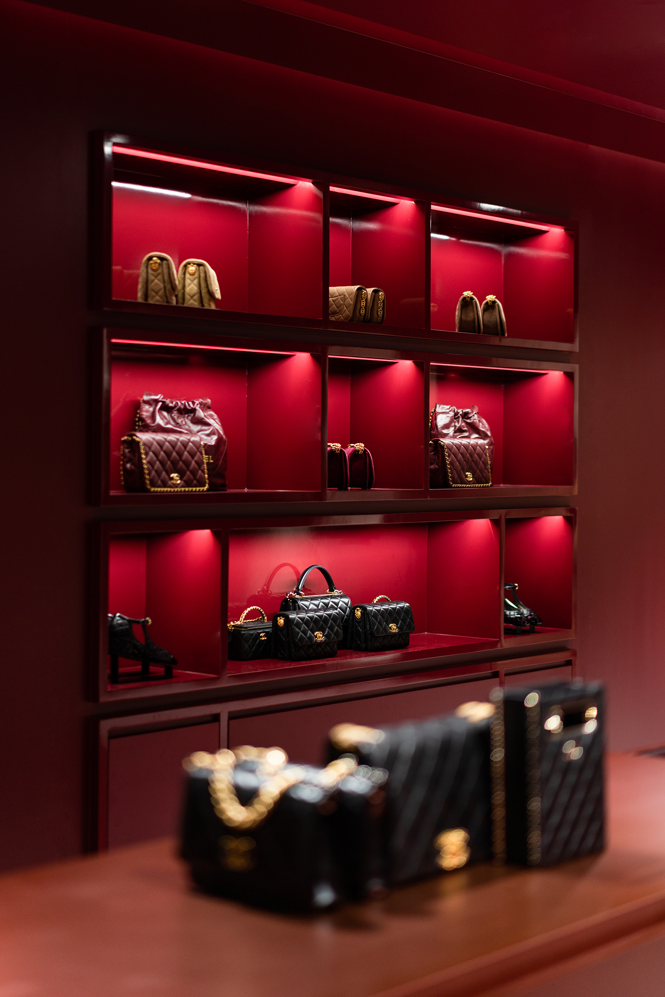 제주 남쪽 해변의 절경을 한눈에 감상할 수 있는 제주신라호텔에 자리 잡은 샤넬 제주 팝업 부티크에 들어서기 전, 샤 넬의 컬러 코드를 연상시키는 베이지와 화이트를 사용해 고요하고 우아한 느낌을 자아내는 공간이 마음을 편안하게 다스린 다. 이어지는 직사각형 구조의 버건디 레드 컬러 공간을 중심으로 핸드백과 스몰 레더 굿즈 및 액세서리가 가지런히 열을 맞 춰 서 있다. 유광과 무광을 능수능란하게 오가는 깊이 있는 색감은 샤넬 핸드백 특유의 부드러운 가죽 안감을 연상시키는 동 시에 아늑한 리듬감을 선사한다. 백 전용 공간에는 영롱하게 빛나는 컬러와 레디투웨어 컬렉션의 화려한 트위드 스타일 백과 11.12 핸드백, 2.55 핸드백, 2022년 봄/여름 레디-투-웨어 컬렉션 쇼에서 공개한 샤넬 22 백까지 지금 가장 뜨겁게 떠오르는 제품을 만날 수 있다.