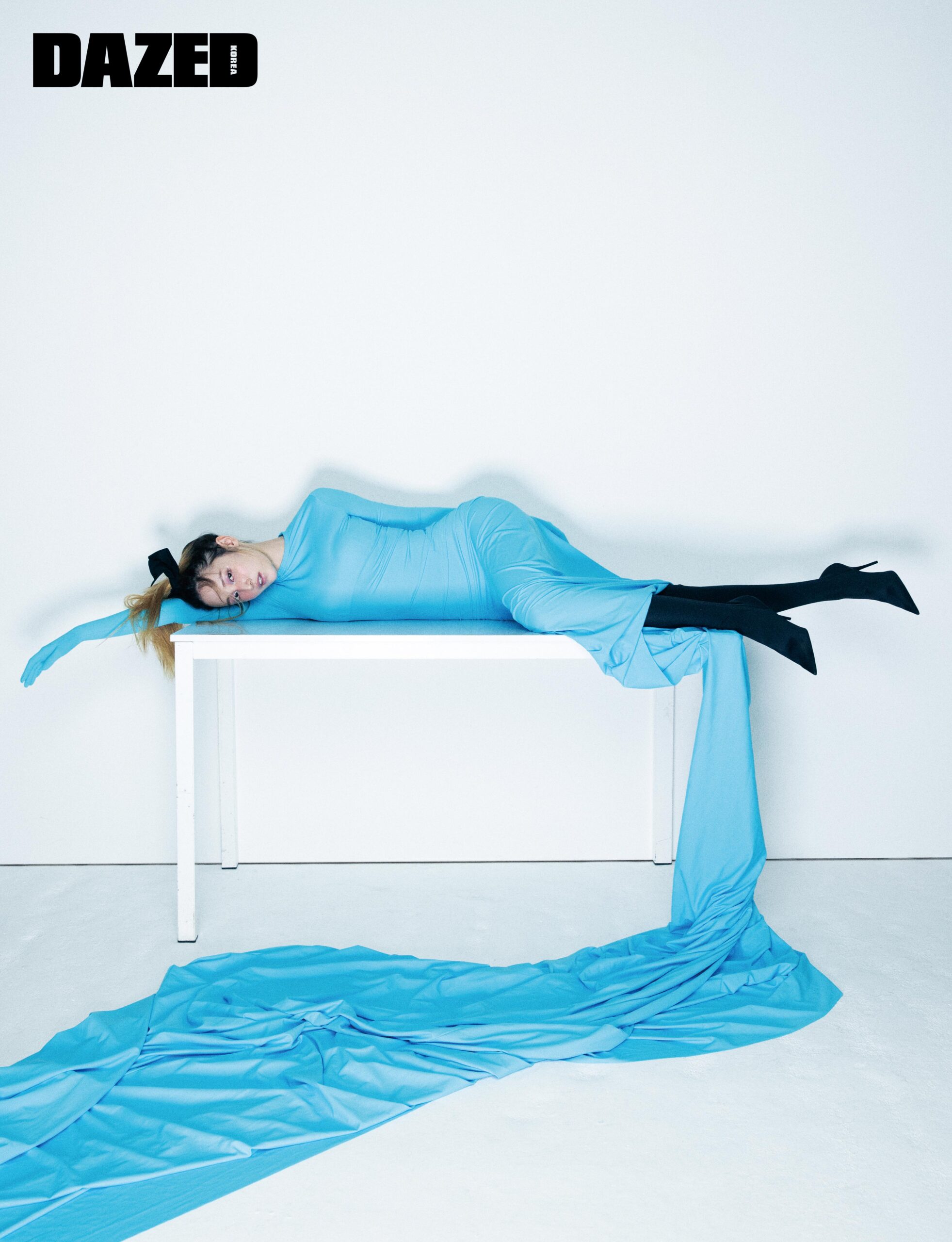 블루 드레스와 부츠는 발렌시아가(Balenciaga), 헤어핀은 소피 부하이 by 10 꼬르소 꼬모 서울(Sophie Buhai by 10 Corso Como Seoul).