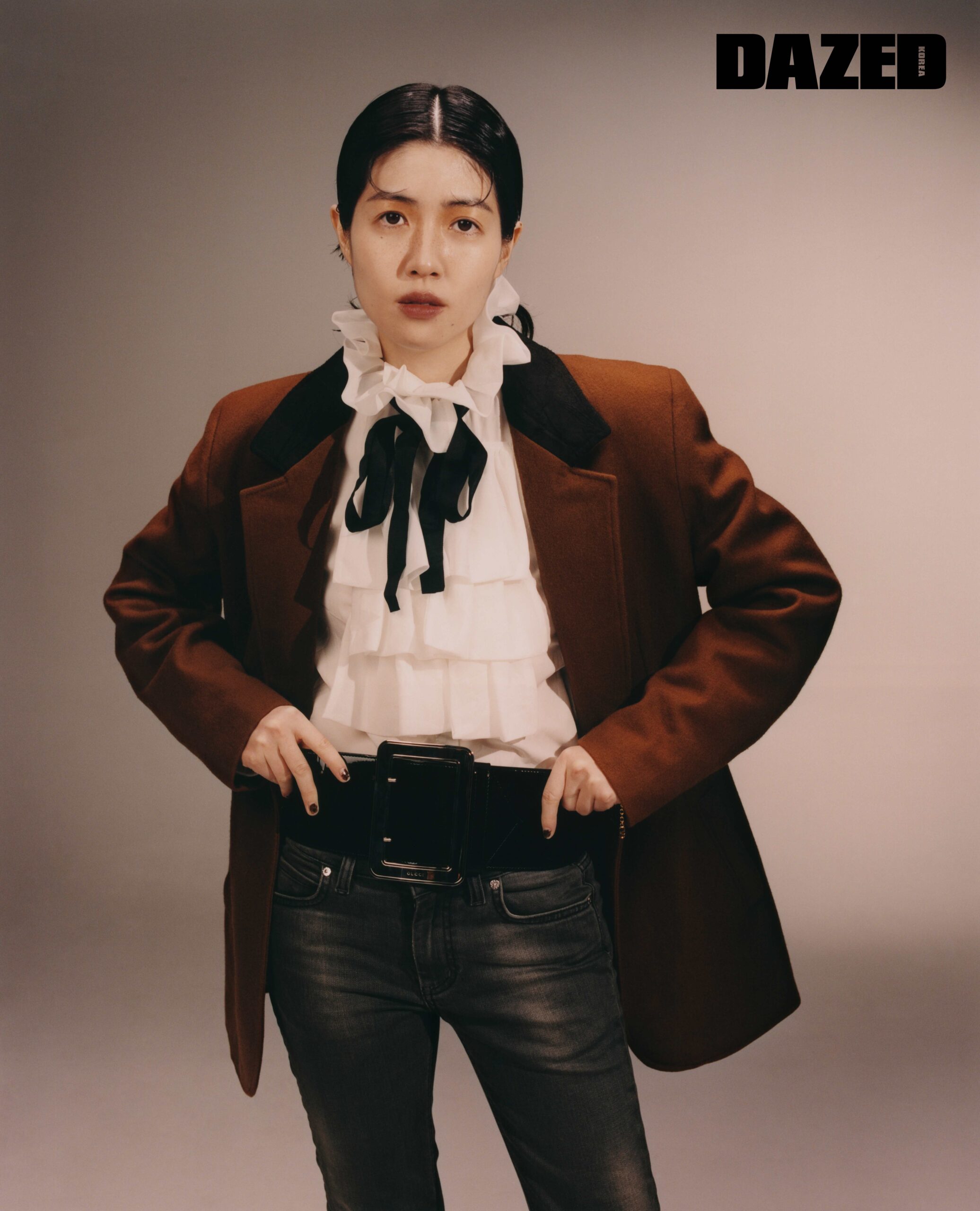 버클 벨트는 구찌(Gucci), 브라운 컬러 재킷과 프릴 디테일의 화이트 블라우스, 데님 팬츠는 모두 에디터의 것.