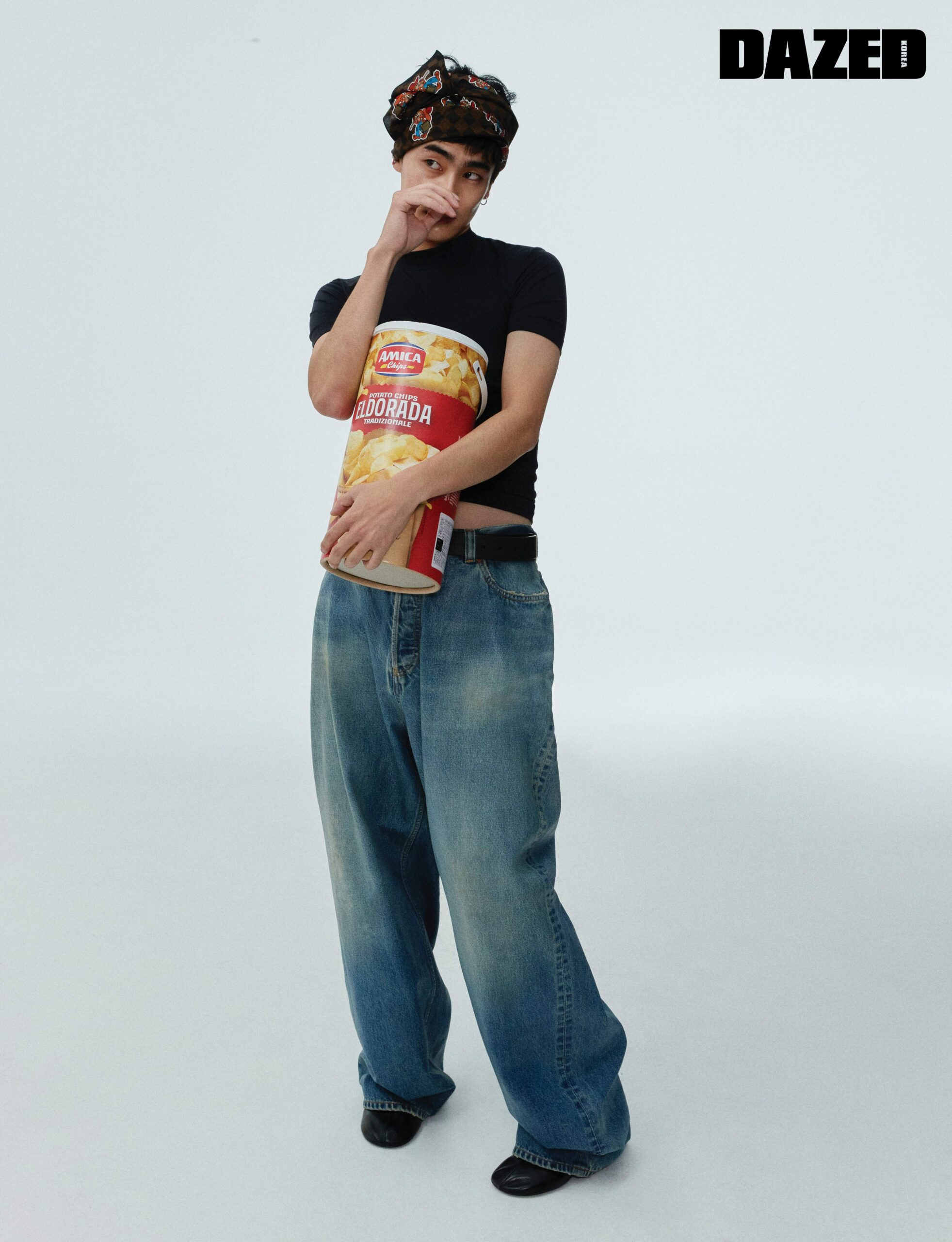 반팔 톱과 데님 팬츠, 부츠, 벨트는 모두 발렌시아가(Balenciaga), 헤어 액세서리로 연출한 스카프는 루이 비통(Louis Vuitton).