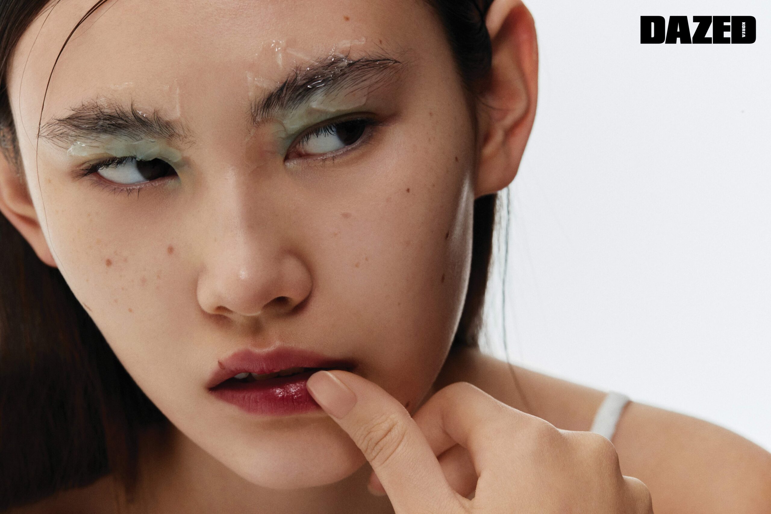 젤리 텍스처로 완성한 자유분방해 보이는 눈썹. 눈썹의 형태와 컬러를 살짝만 비틀면 메이크업에 재미를 더할 수 있다. 먼저 팔레트 보떼 데 이으 골저스 플로라 블루 컬러를 손가락에 묻혀 눈두덩에 러프하게 터치한 다음, 에끌라 드 보떼 에페 뤼미에르 멀티 유즈 젤 글로스를 미술용 나이프에 묻혀 눈썹에까지 두툼하게 펴 바른다.