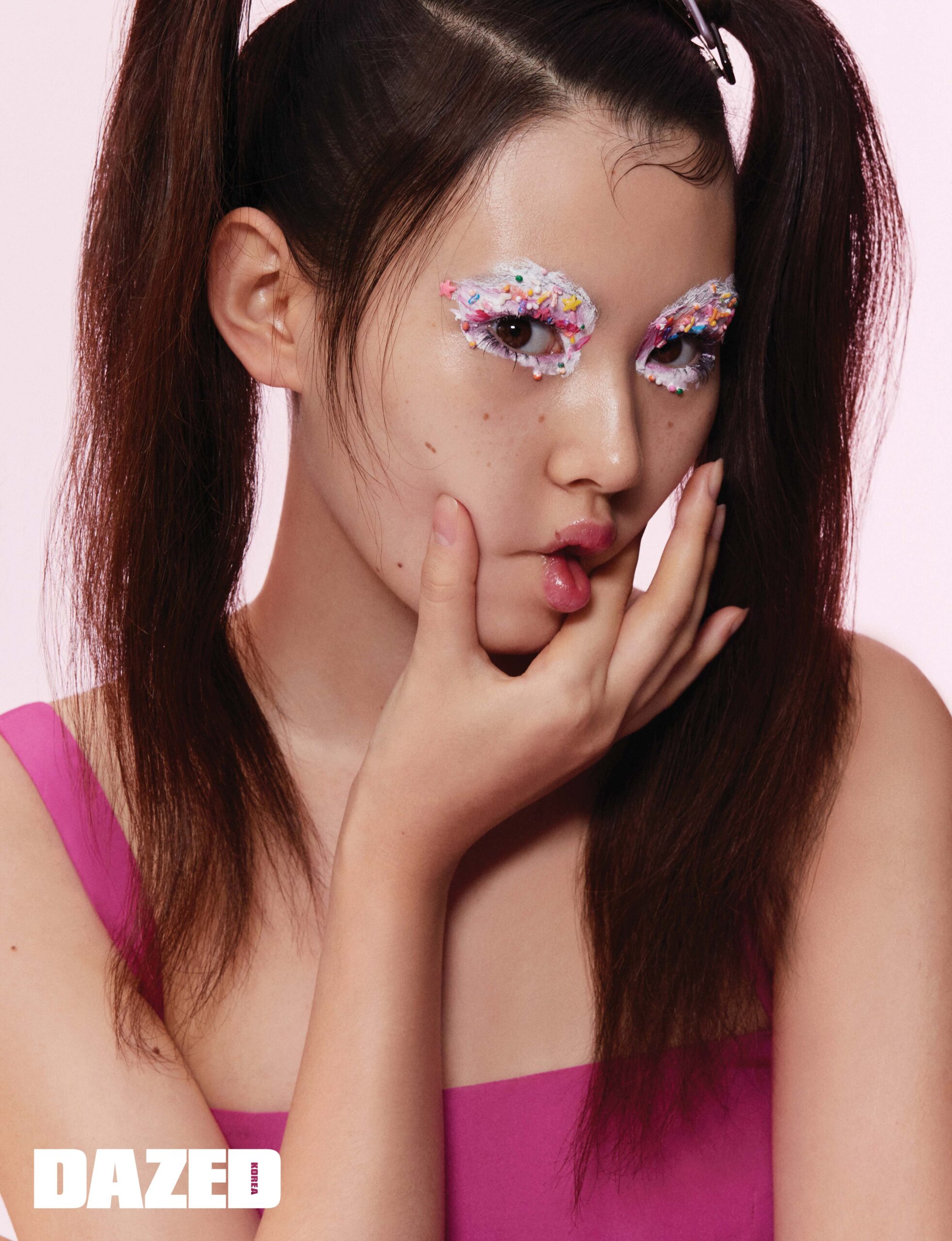 키치한 컵케이크를 눈가에 그대로 옮긴 듯한 핼러윈 메이크업. 크림 타입 아이섀도 프로 롱웨어 페인트 팟의 화이트 컬러로 기본 아이싱 작업을 한 뒤 핑크빛 섀도와 글리터로 겹겹이 레이어링하고 베이킹용 스프링클을 장식한다.
