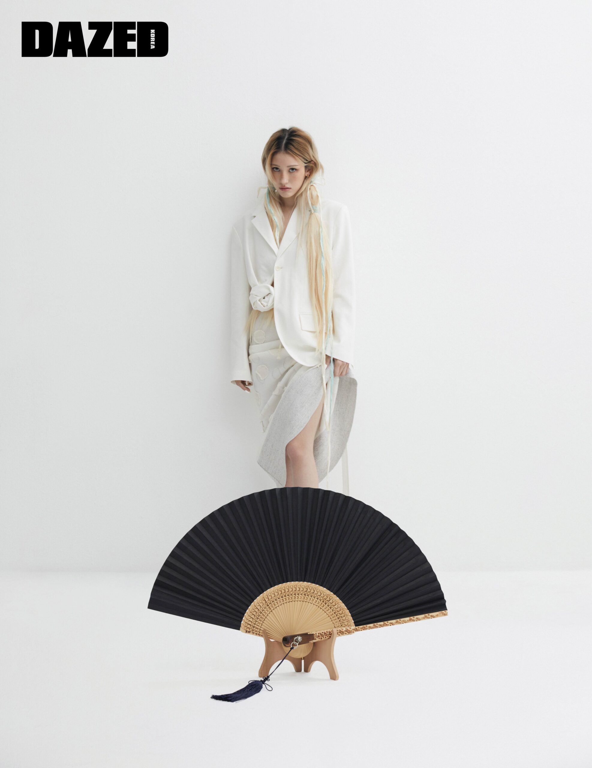 매듭 장식의 재킷과 도트 아플리케 장식의 스커트는 자크뮈스(Jacquemus). 흑색 합죽선은 국가무형문화재 선자장 김동식 장인의 작품.