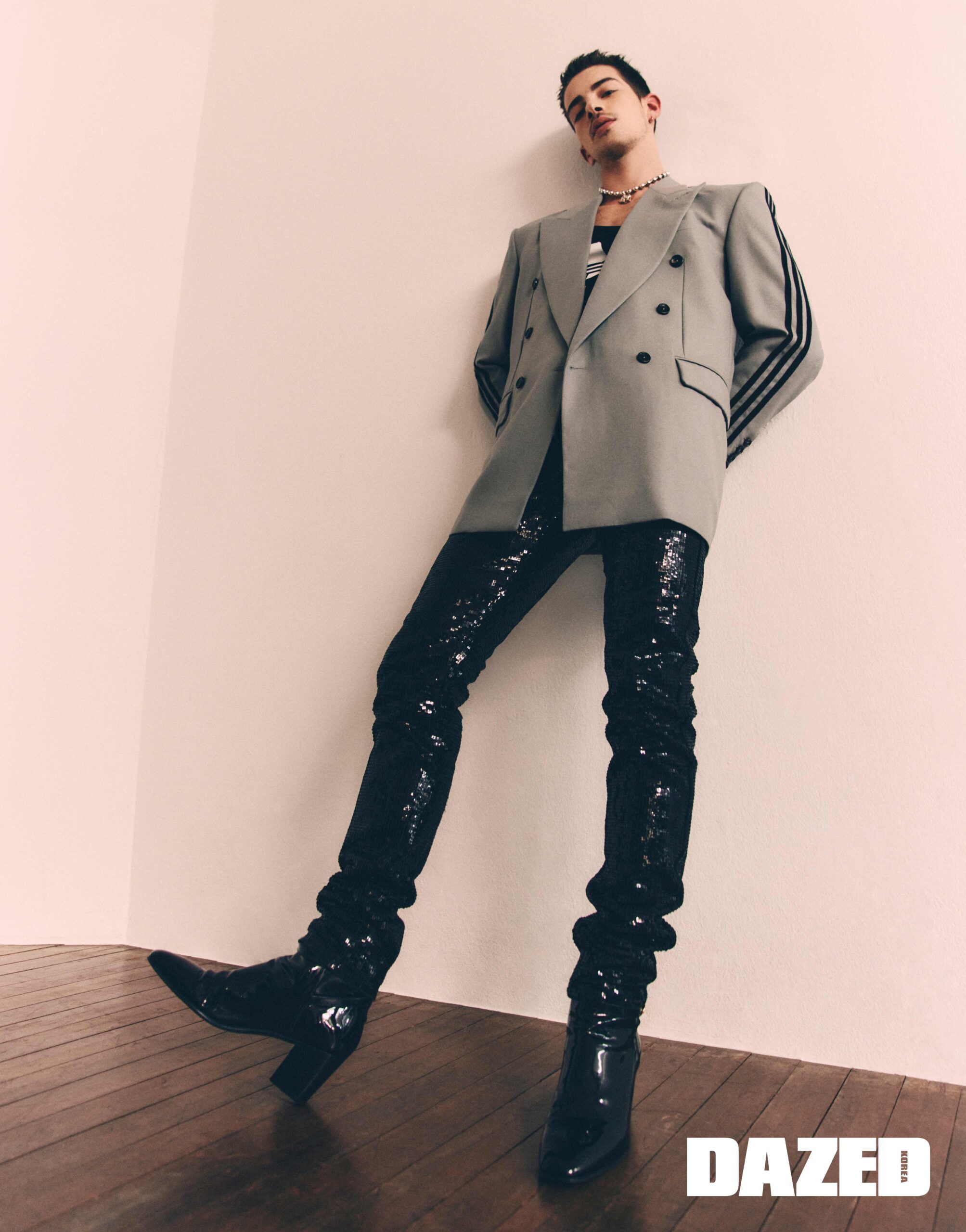 더블브레스트 재킷과 저지 탱크톱은 아디다스 × 구찌(adidas × Gucci), 부츠는 로랑 by 안토니 바카렐로(Saint Laurent by Anthony Vaccarello), 팬츠와 네크리스는 스타일리스트의 것.